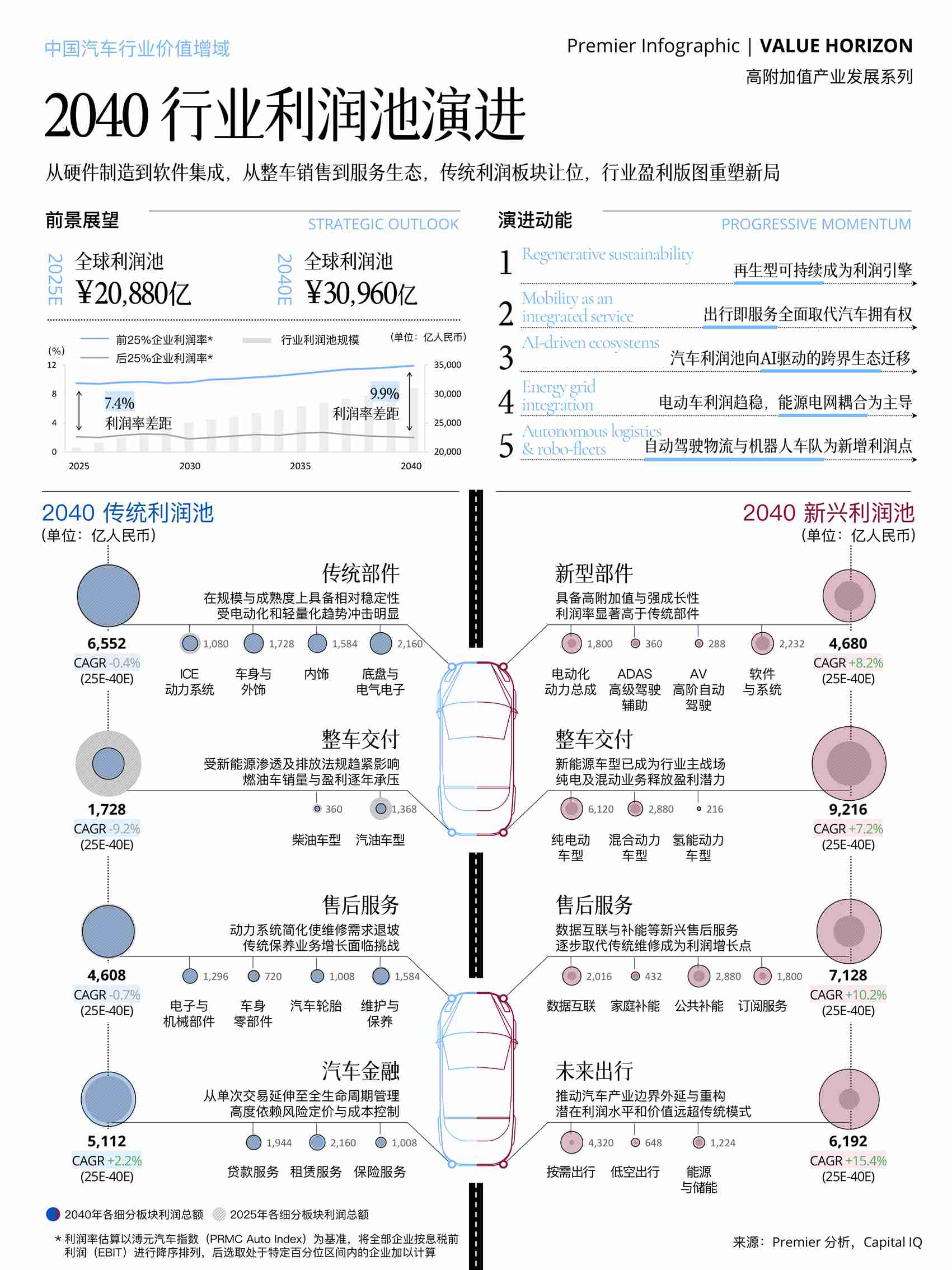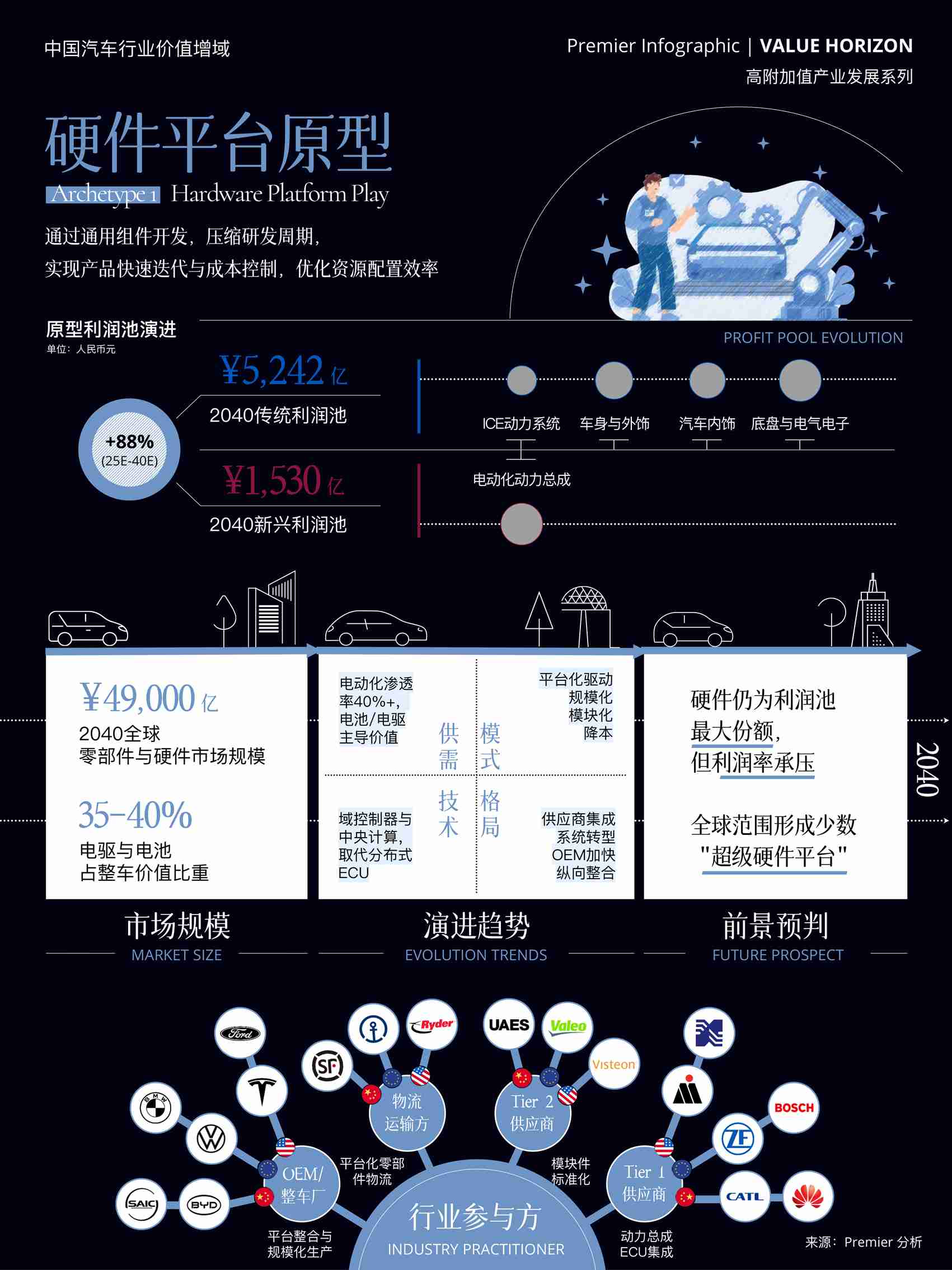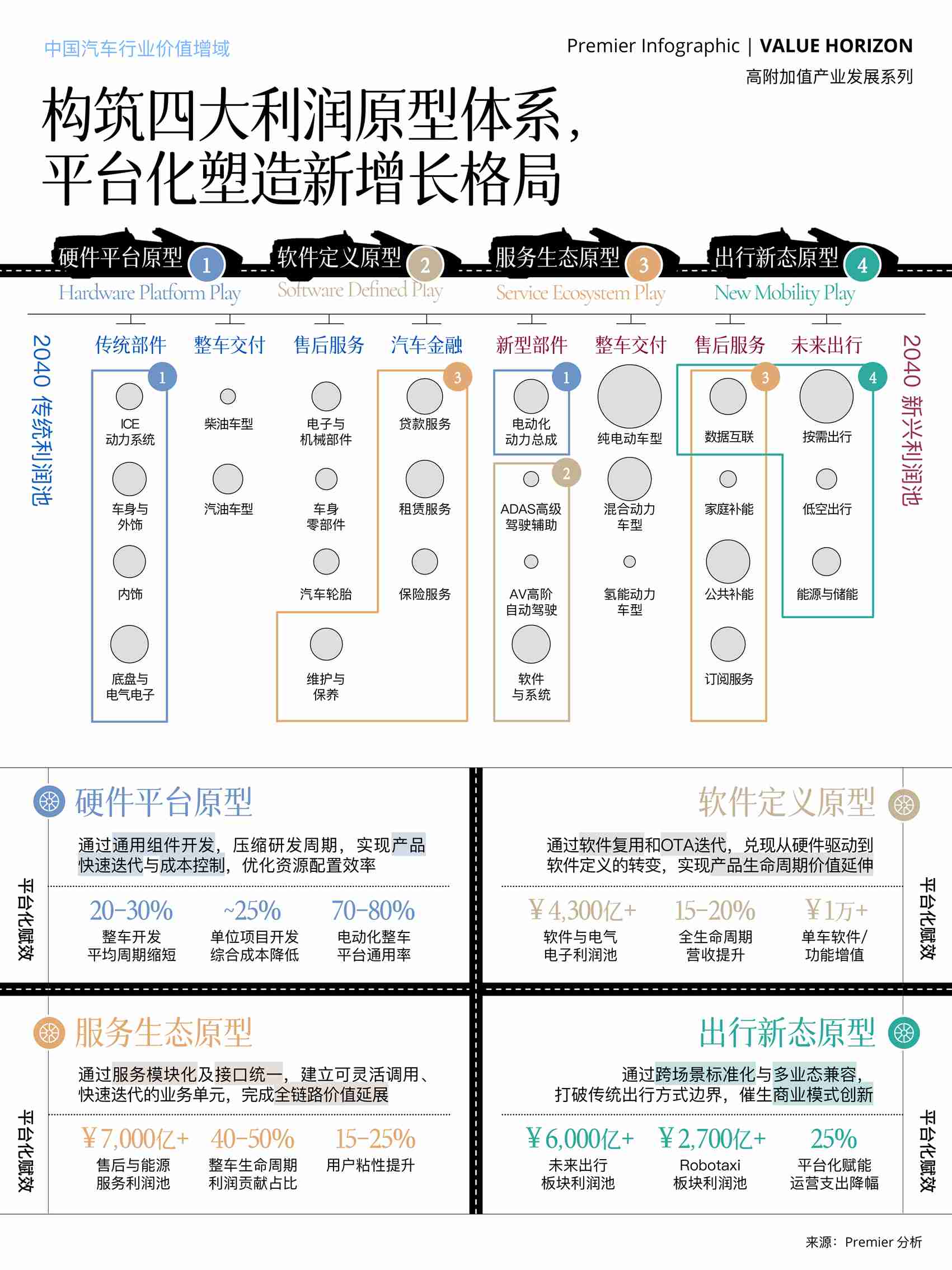 进一步,Premier通过对汽车产业高附加值来源的系统性重划,提出以四大利润池原型 (Profit Pool Archetypes) 为核心的价值框架: