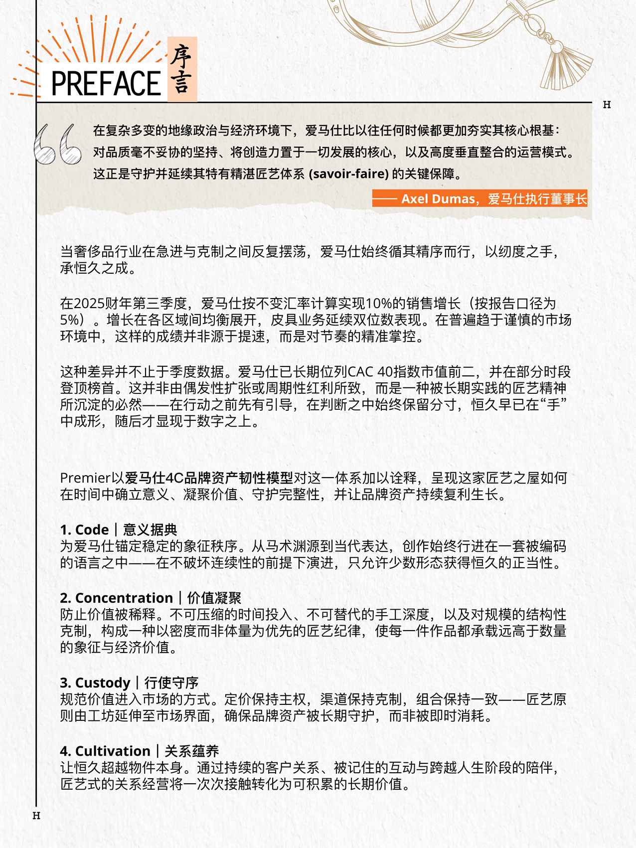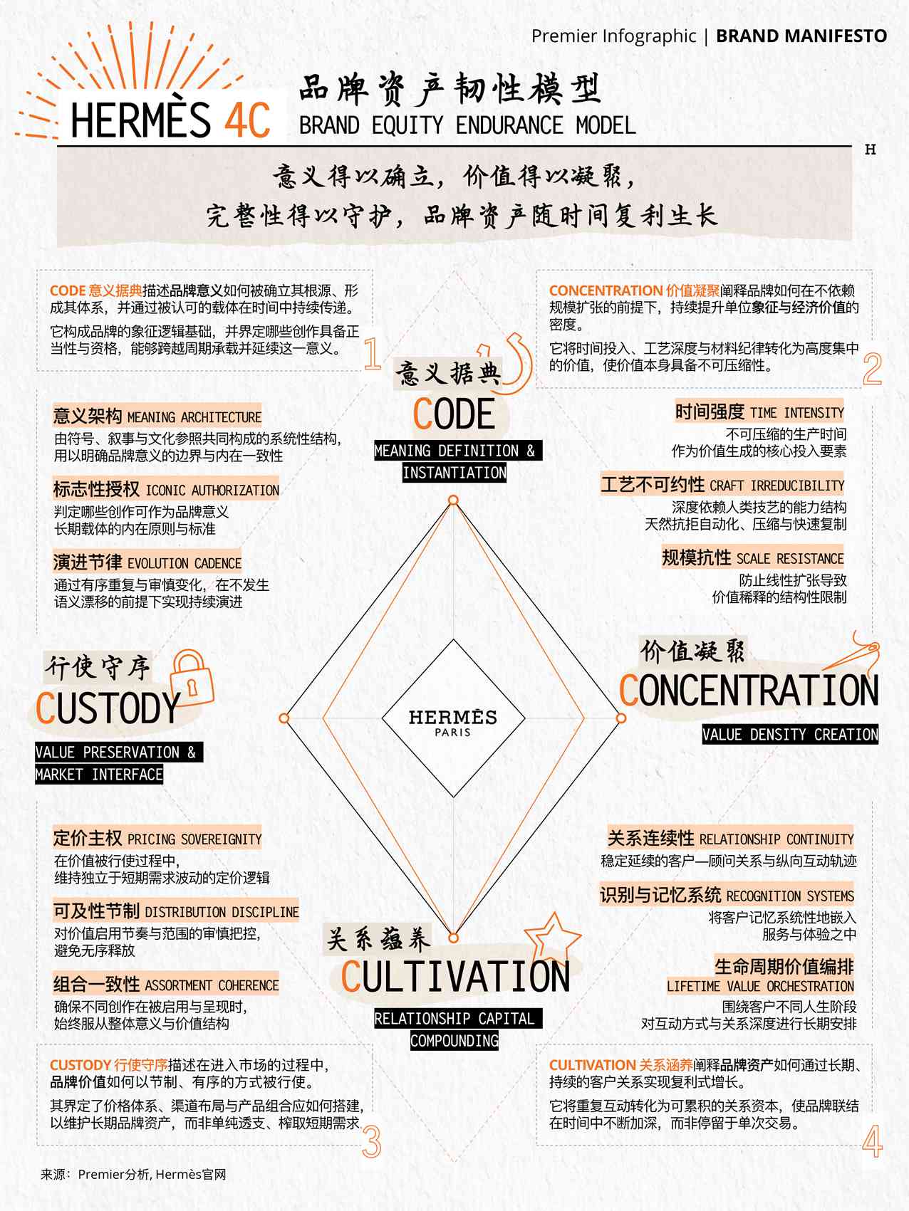 Premier以爱马仕4C品牌资产韧性模型对这一体系加以诠释,呈现这家匠艺之屋如何在时间中确立意义、凝聚价值、守护完整性,使品牌资产持续复利生长。