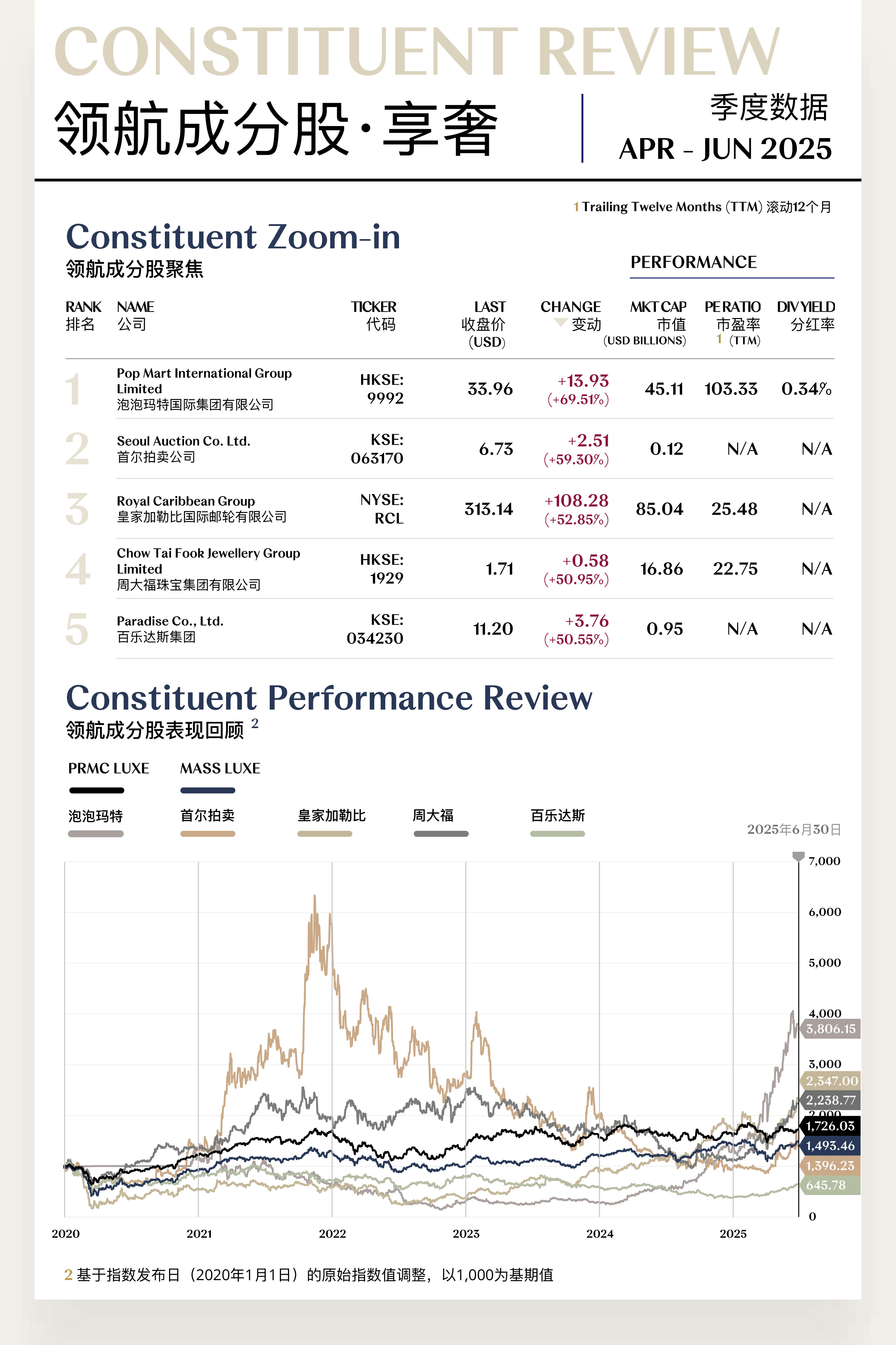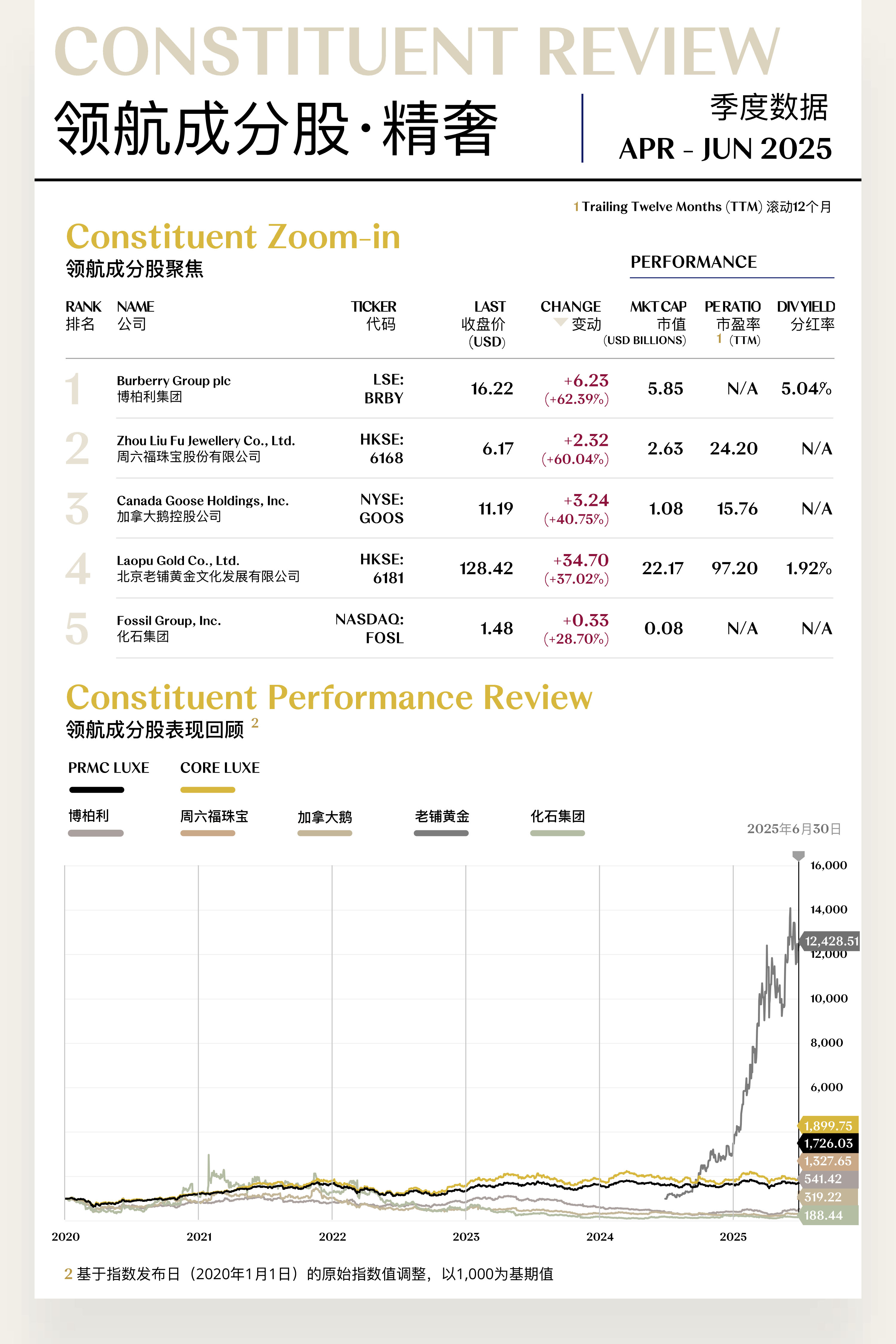 然而,得益于细分领域的亮眼表现,6月单月指数企稳回升21.33点(+1.13%)。特别是珠宝板块凭借避险保值属性获得资本青睐,历峰集团、老铺黄金等标的表现突出。服饰领域表现稳定,博柏利、加拿大鹅凭借战略转型成功实现估值修复,爱马仕则展现出顶级品牌的稳健韧性。