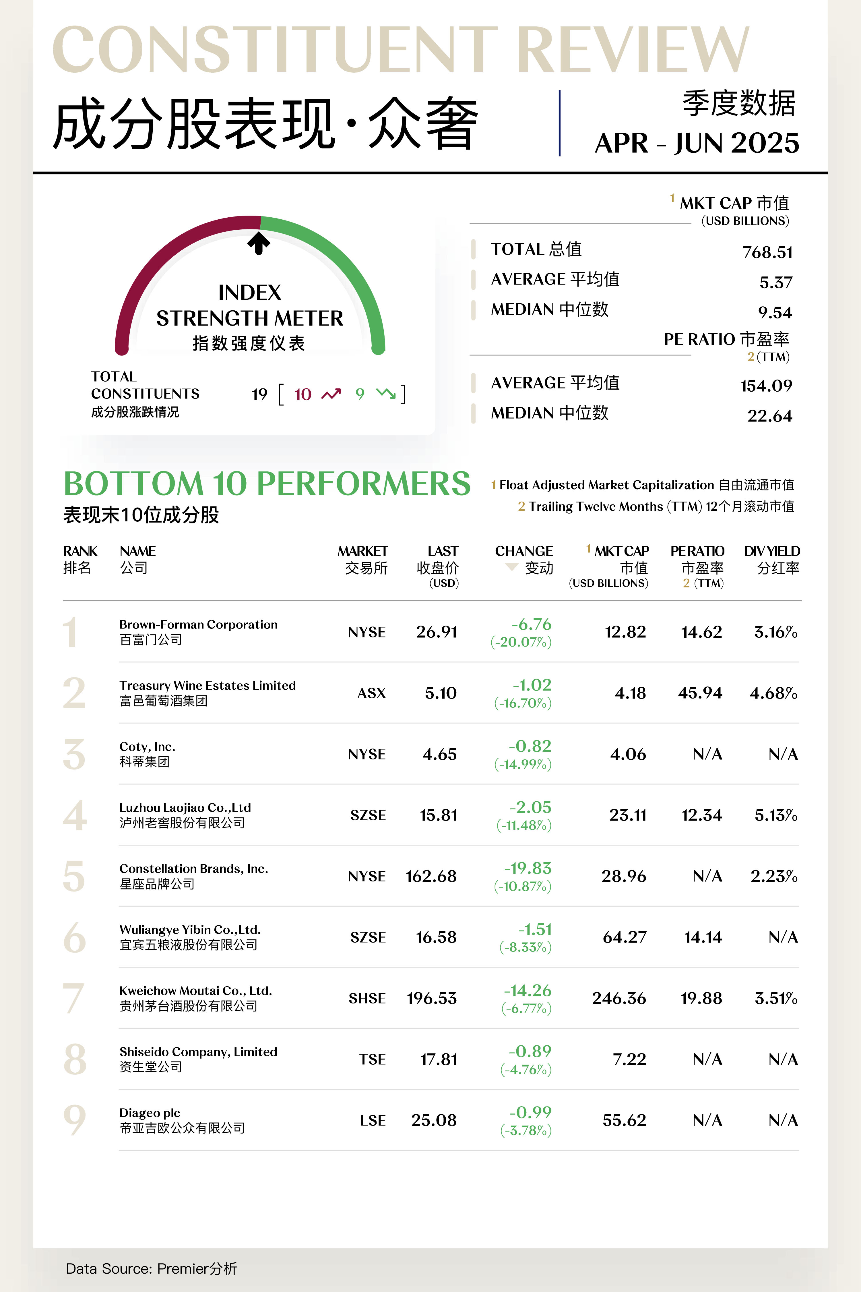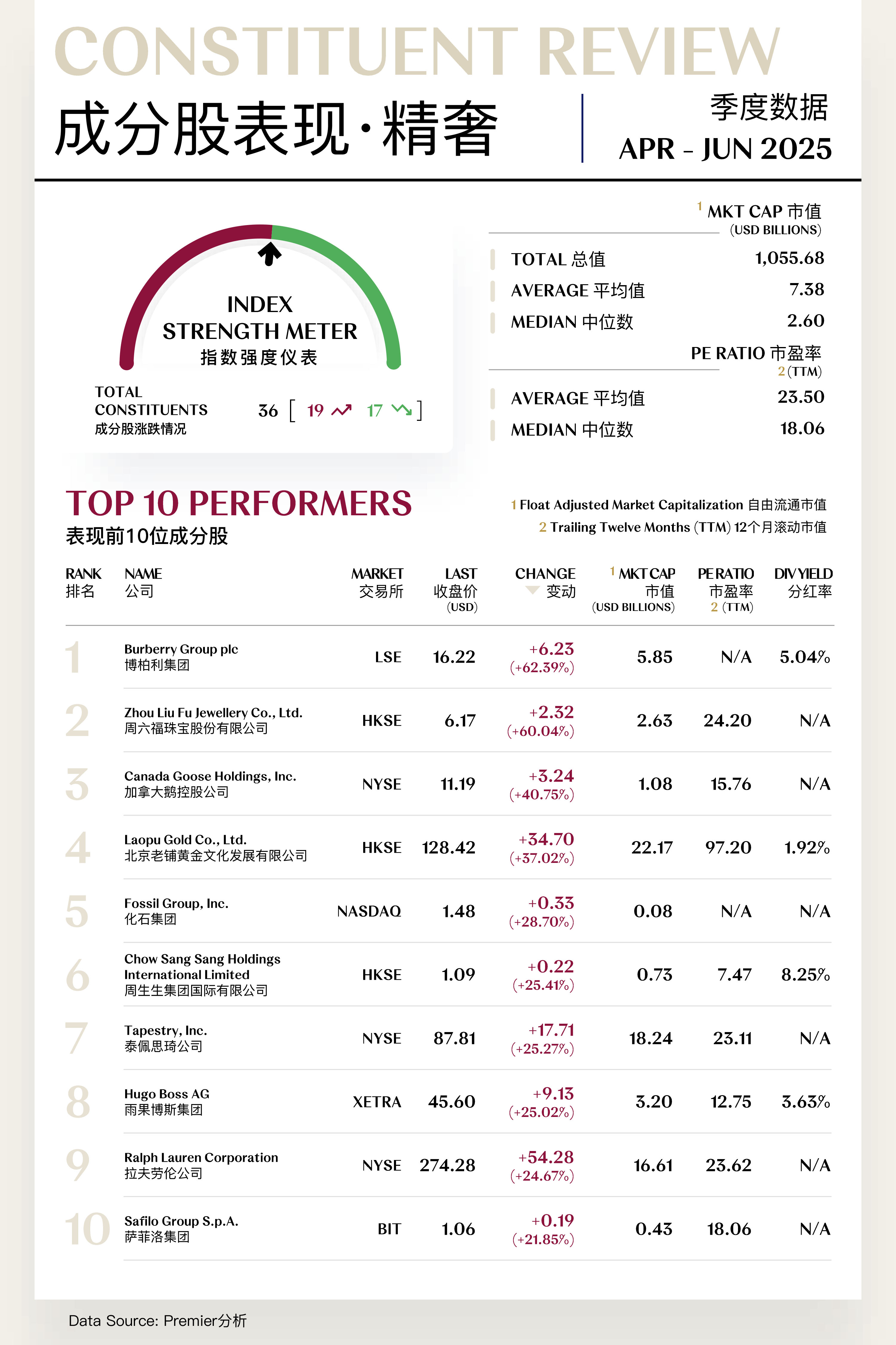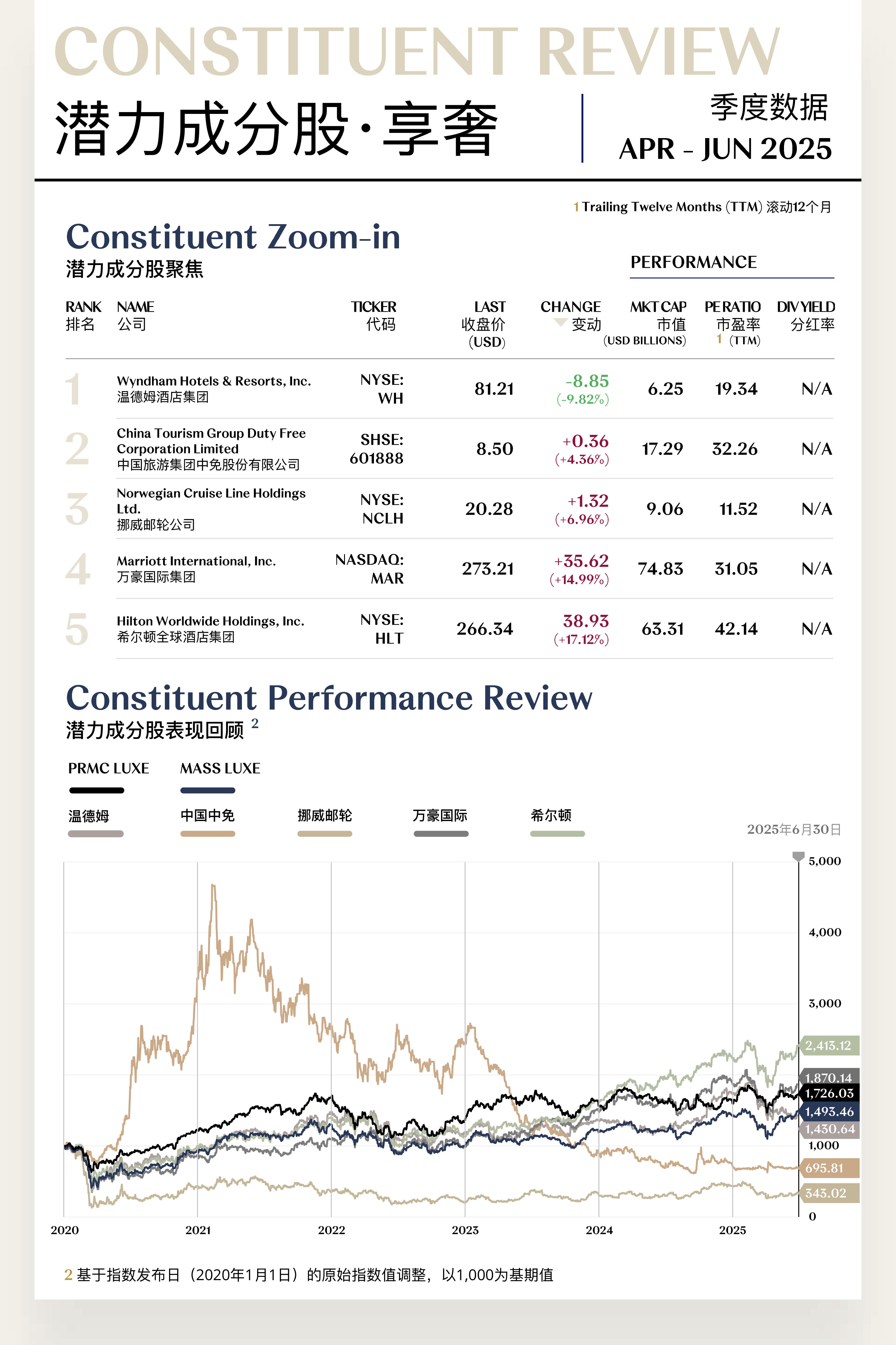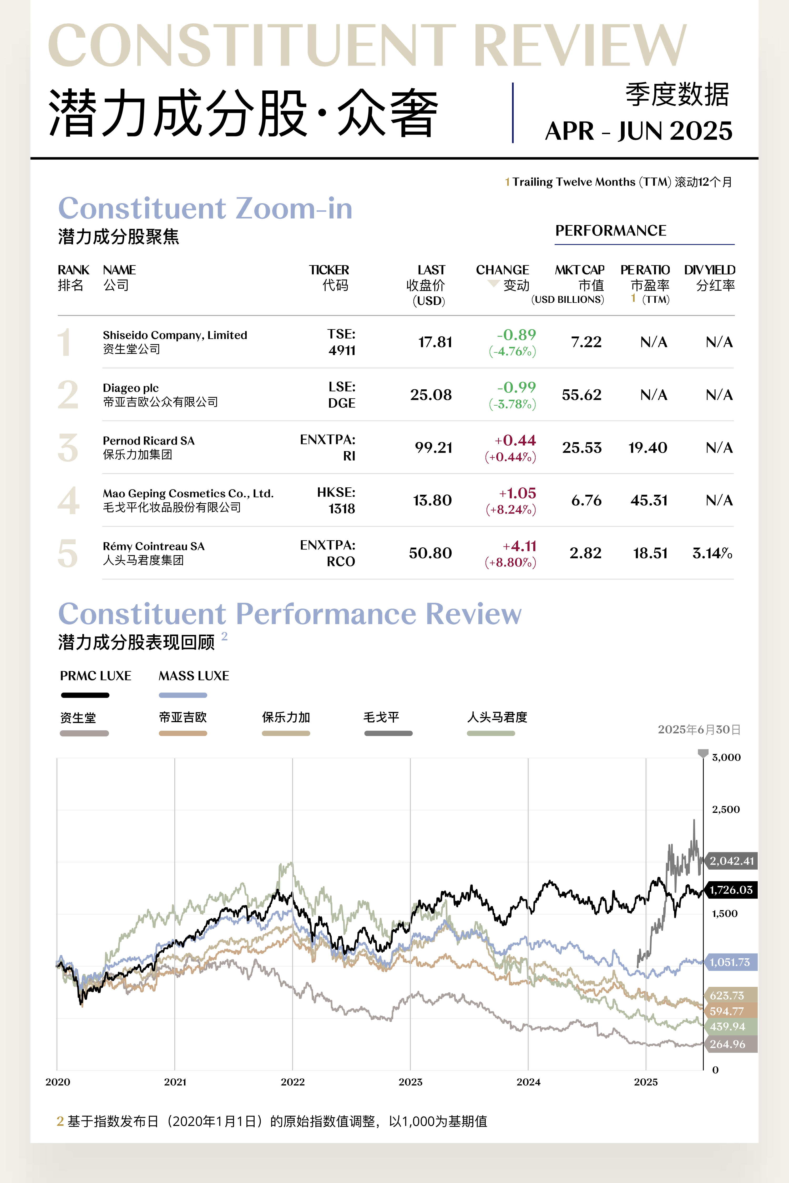 众奢指数收于1,051.73点,季内上涨114.55点,涨幅为12.22%。整体来看,众奢板块于二季度结束此前的长期低位震荡,呈现出温和修复态势,但板块内部表现分化依然显著。