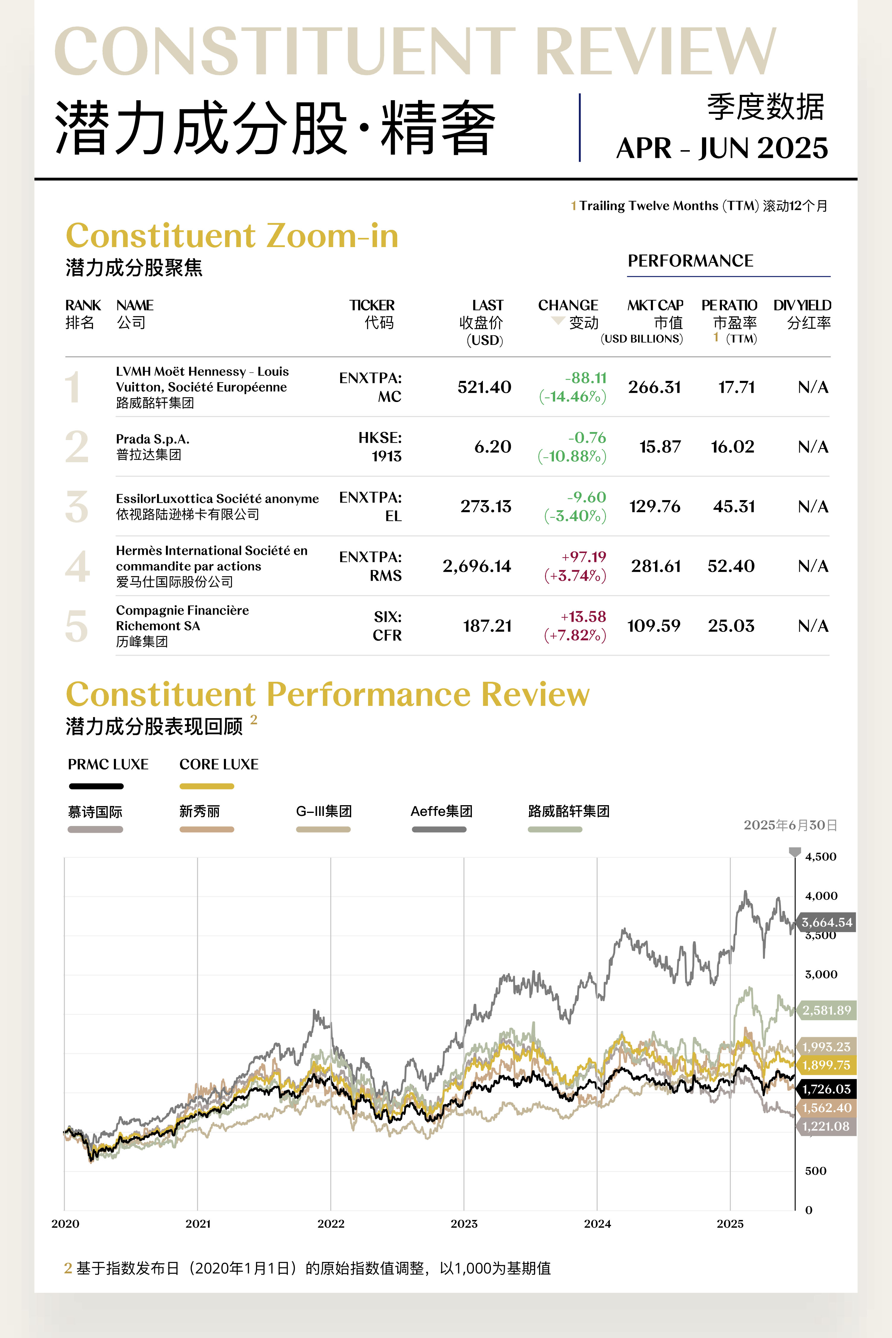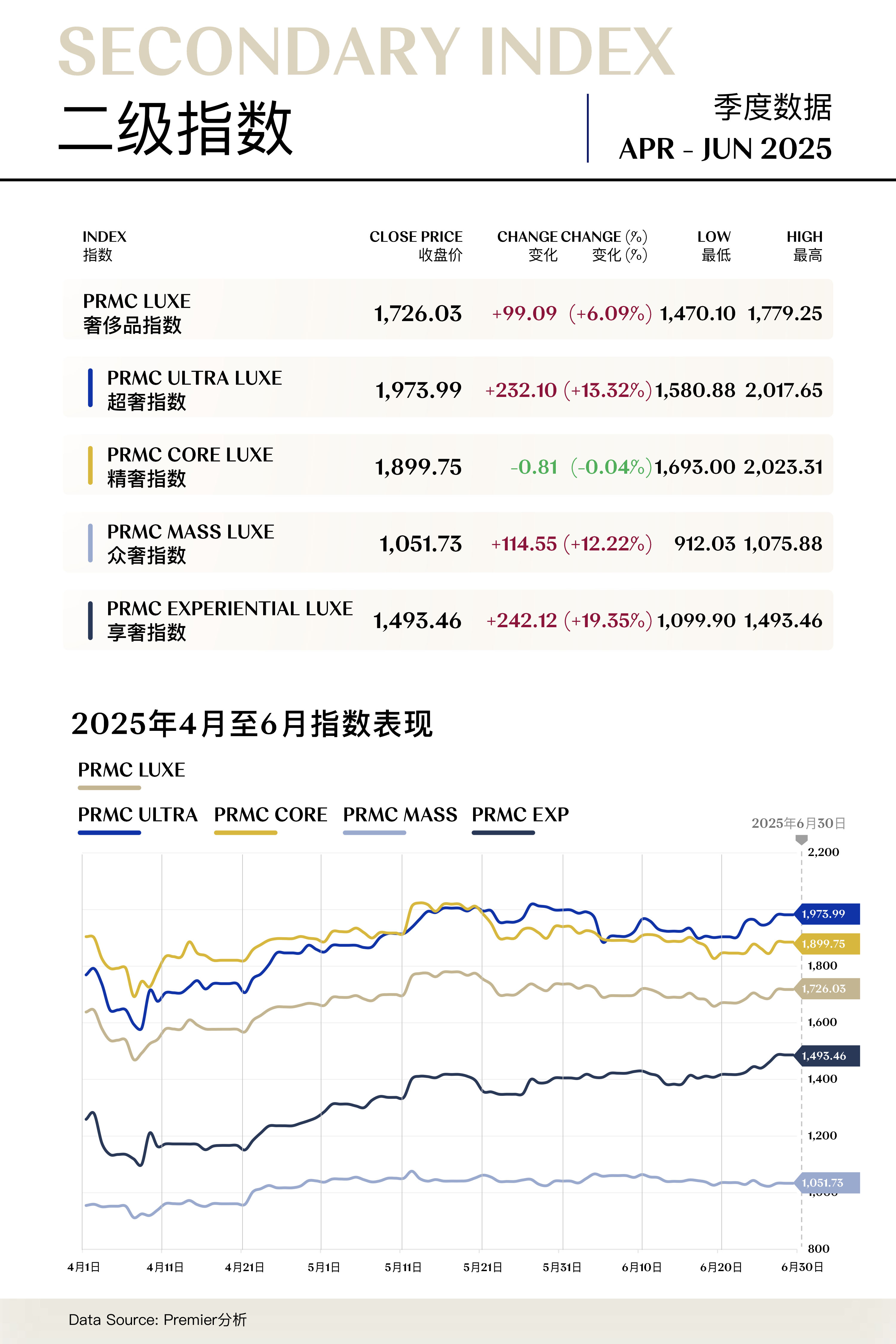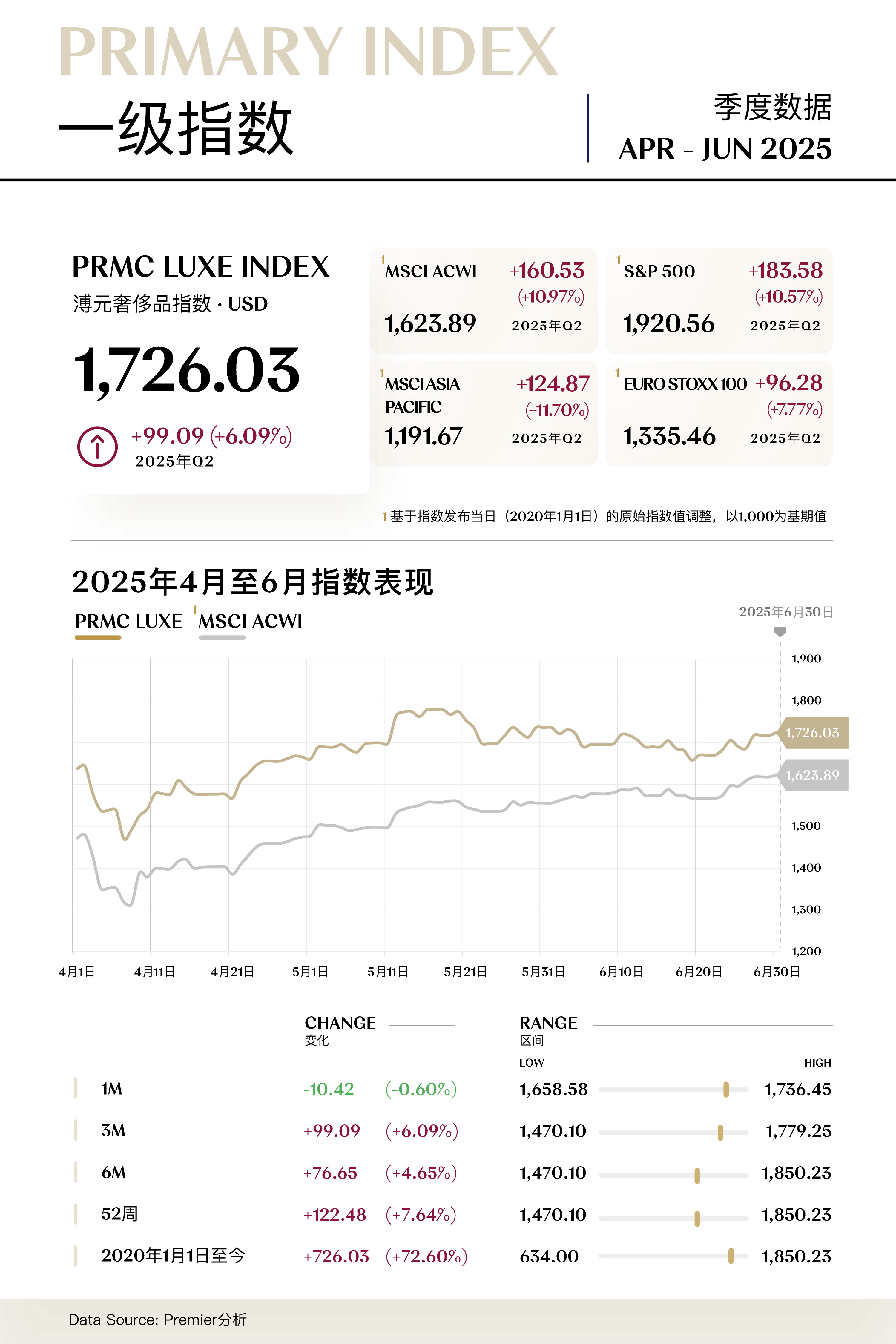 溥元奢侈品指数(PRMC Luxe Index)第二季度收于1,726.03点,季内上行99.09点(+6.09%),表现逊于全球主要指数:MSCI ASIA PACIFIC (+11.70%)、MSCI ACWI (+10.97%)、S&P 500 (+10.57%)、EURO STOXX 100 (+7.77%)。