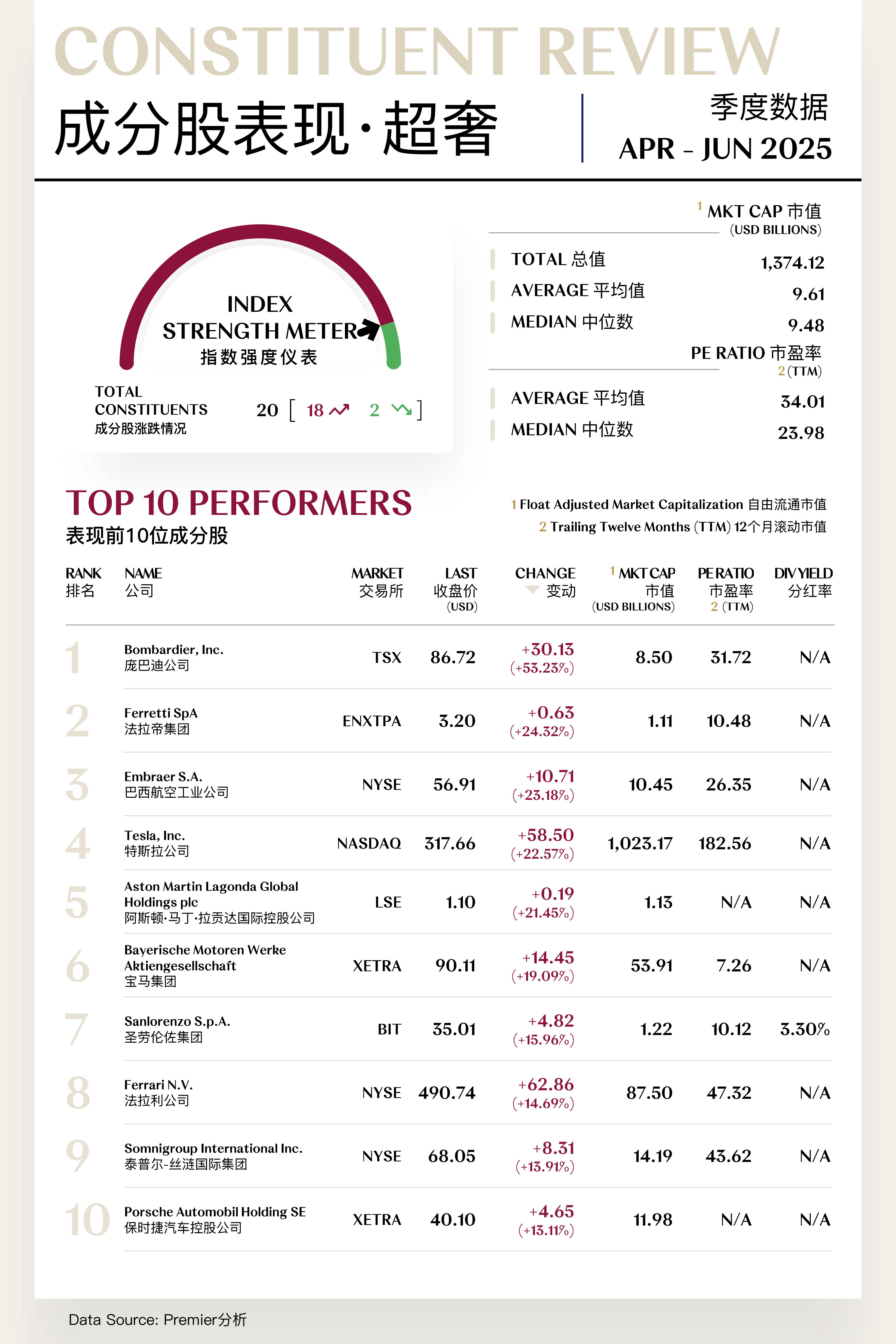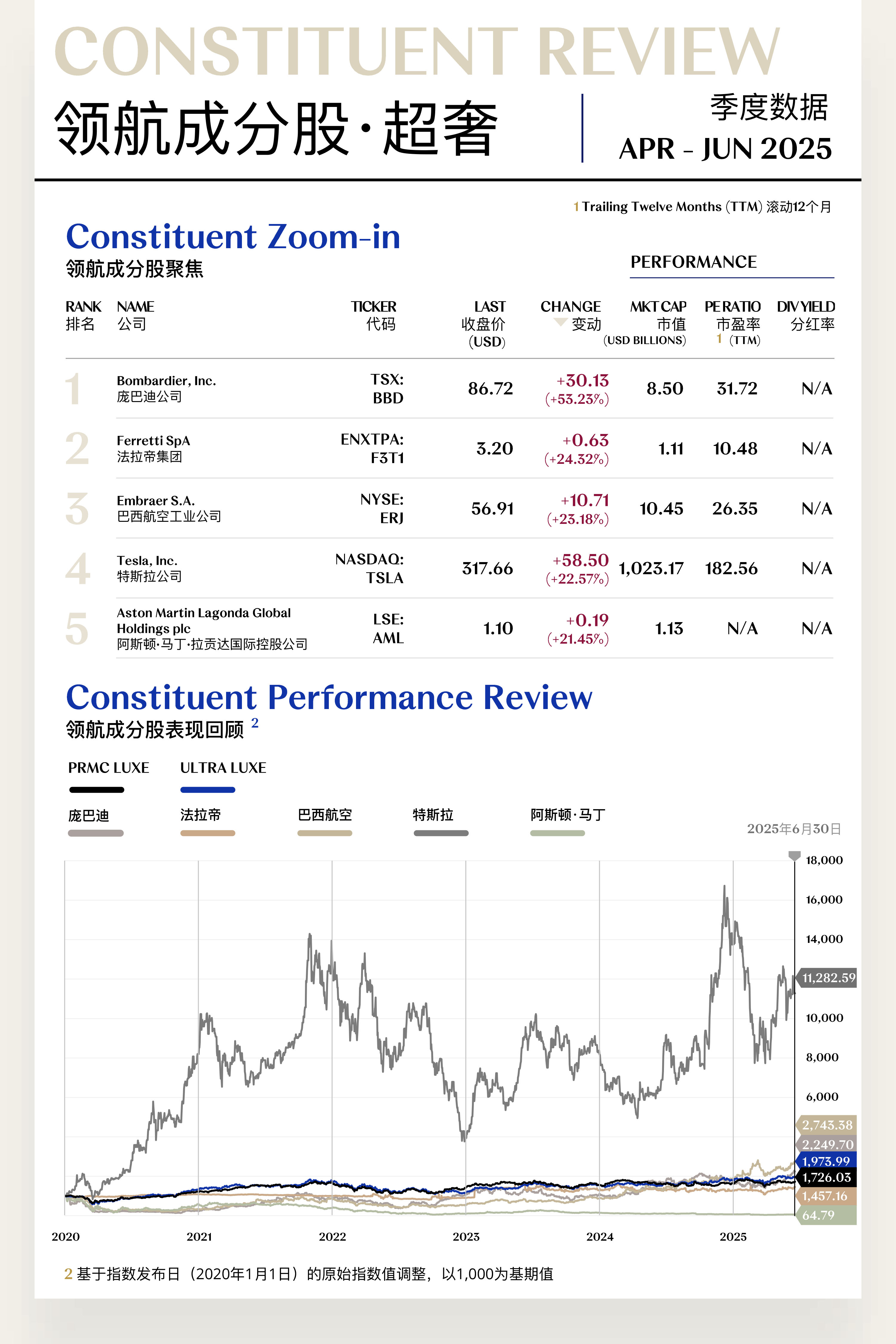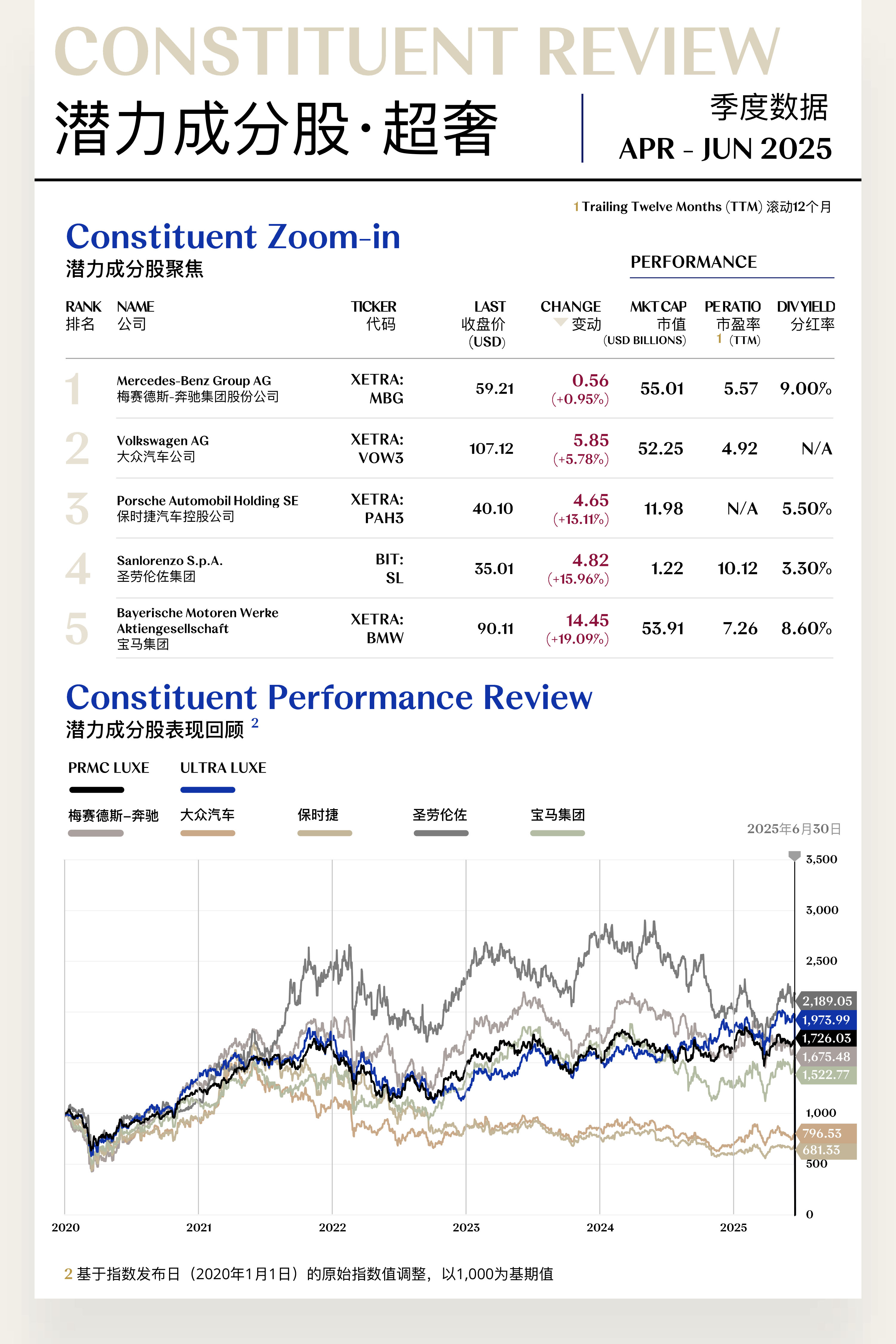 溥元奢侈品指数(PRMC Luxe Index)第二季度收于1,726.03点,季内上行99.09点(+6.09%),表现逊于全球主要指数:MSCI ASIA PACIFIC (+11.70%)、MSCI ACWI (+10.97%)、S&P 500 (+10.57%)、EURO STOXX 100 (+7.77%)。