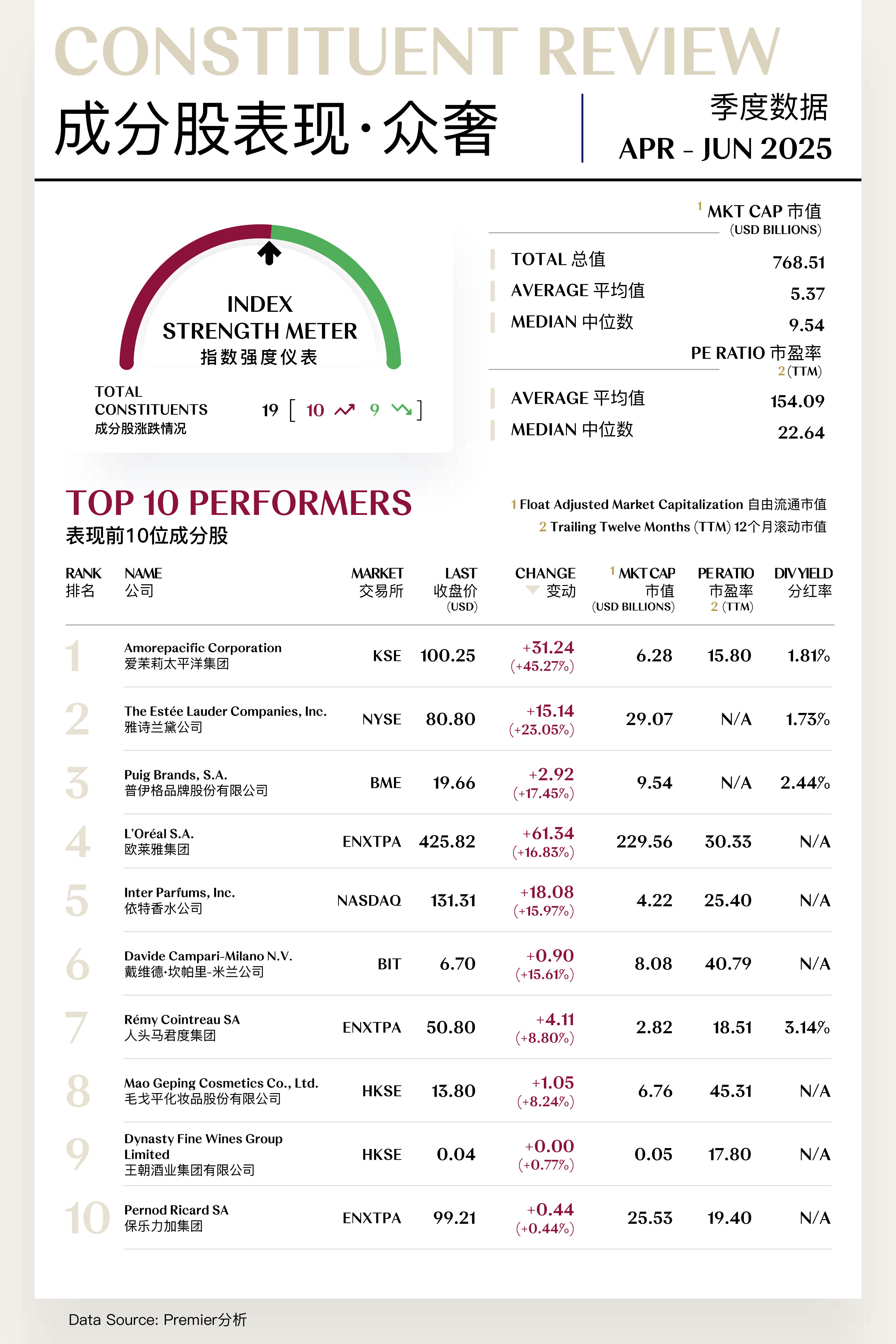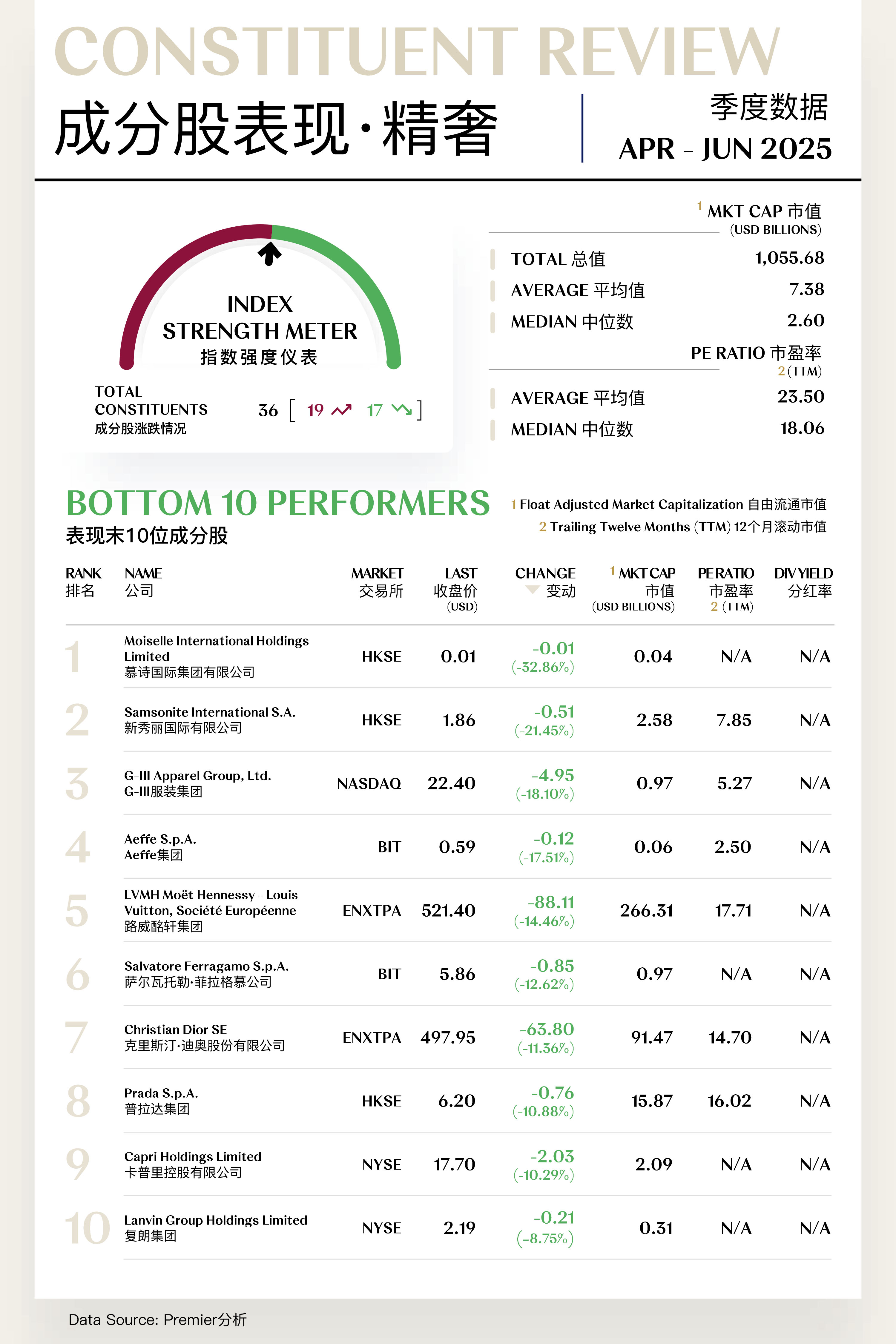 精奢指数收于1,899.75点,季内微跌0.81点,跌幅为0.04%,与前季表现基本持平。第二季度精奢板块延续了"K型"分化的结构性特征,在宏观不确定性背景下展现出相对韧性。季度前期,市场情绪仍受一季度业绩放缓影响,路威酩轩、普拉达等综合性巨头因亚洲市场疲软而估值承压。