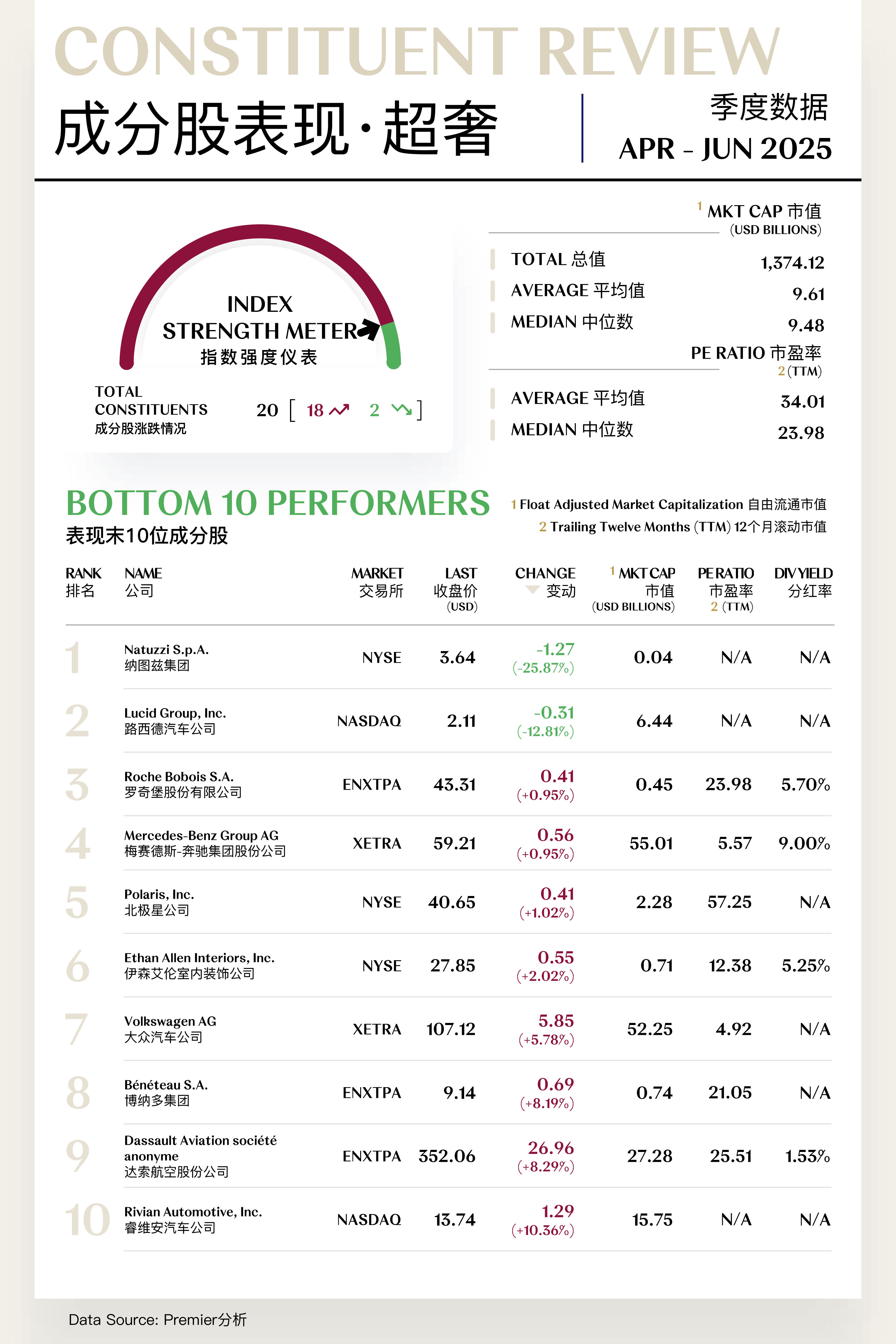 众奢指数(Mass Luxe Index)共包括19支个股,其中10支上涨,9支下跌。