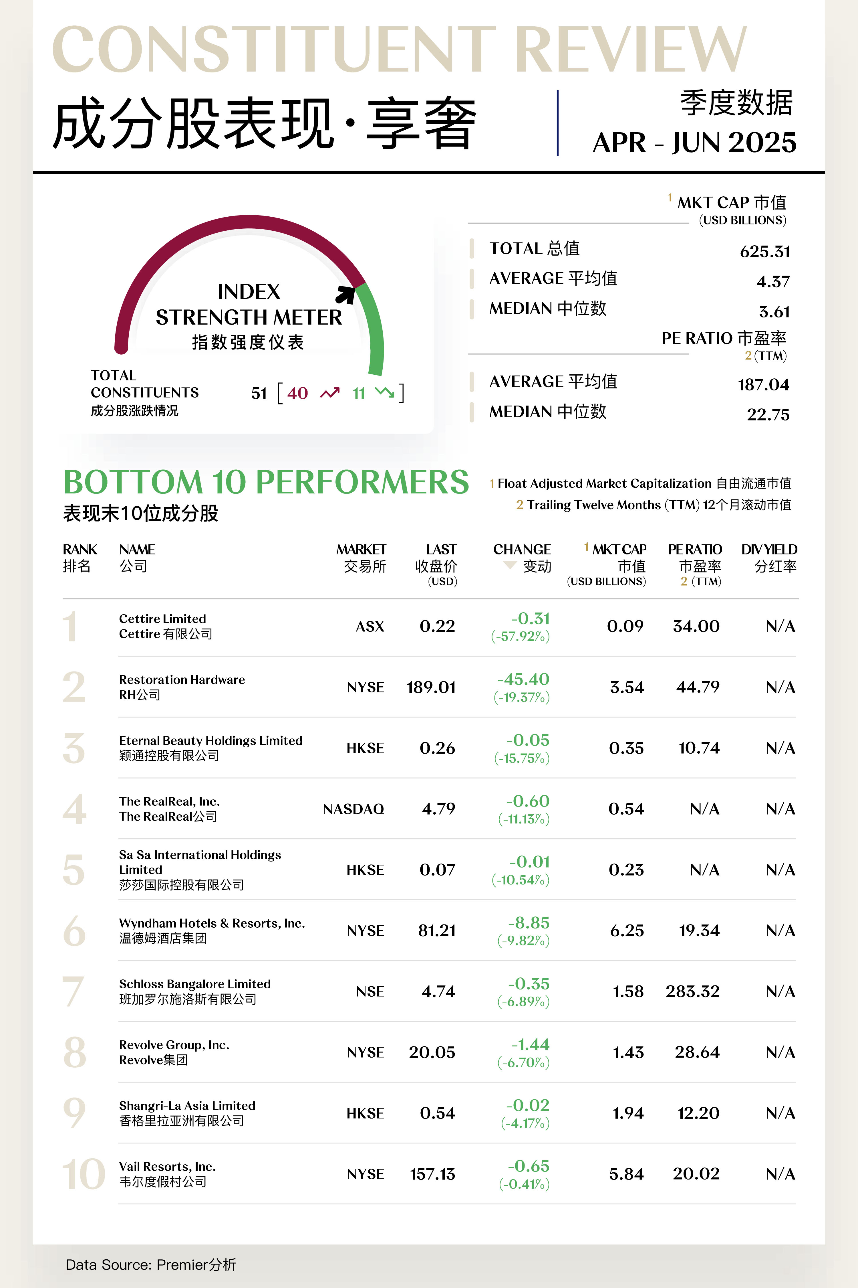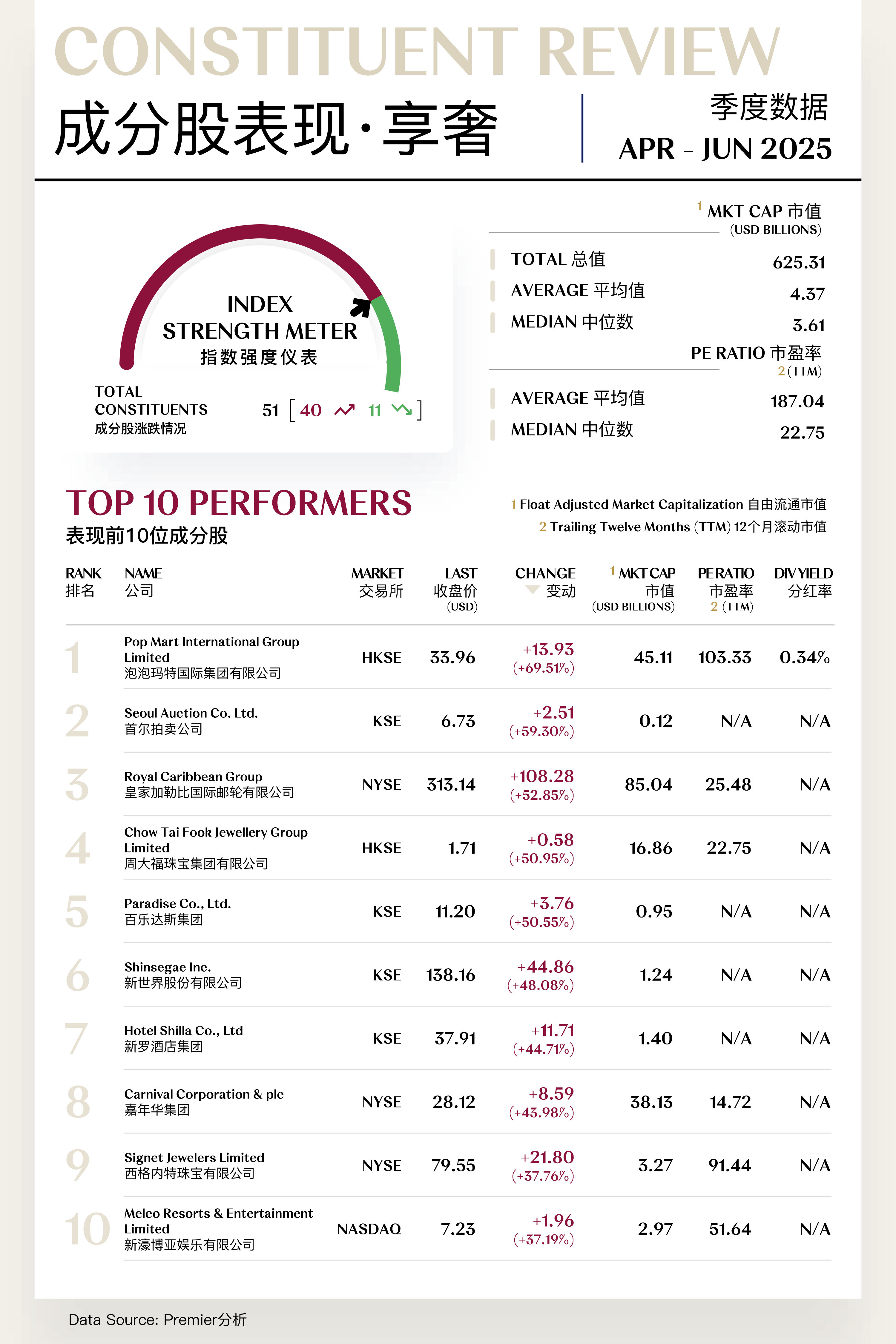 享奢指数(Experiential Luxe Index)共包括51支个股,其中40支上涨,11支下跌。
