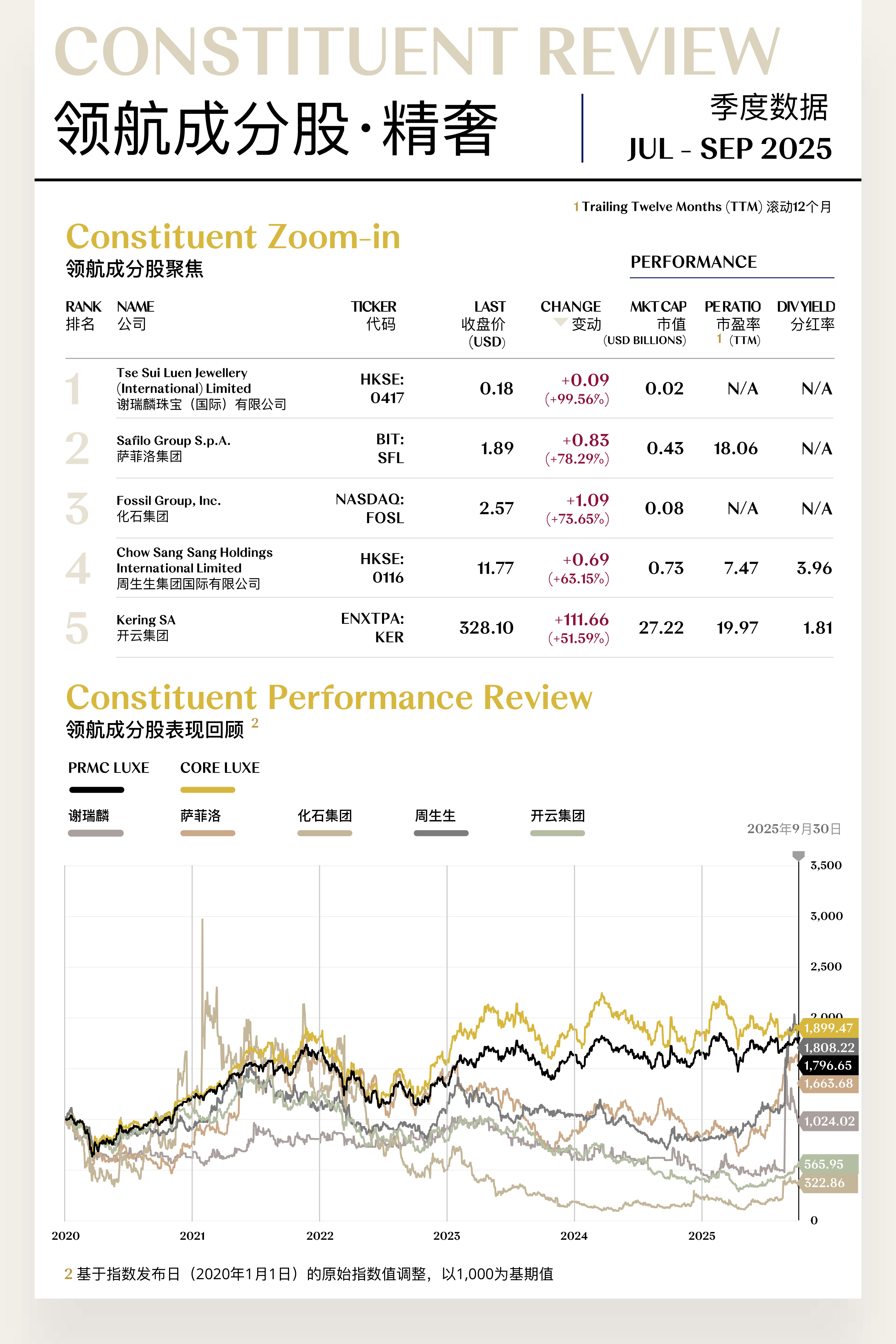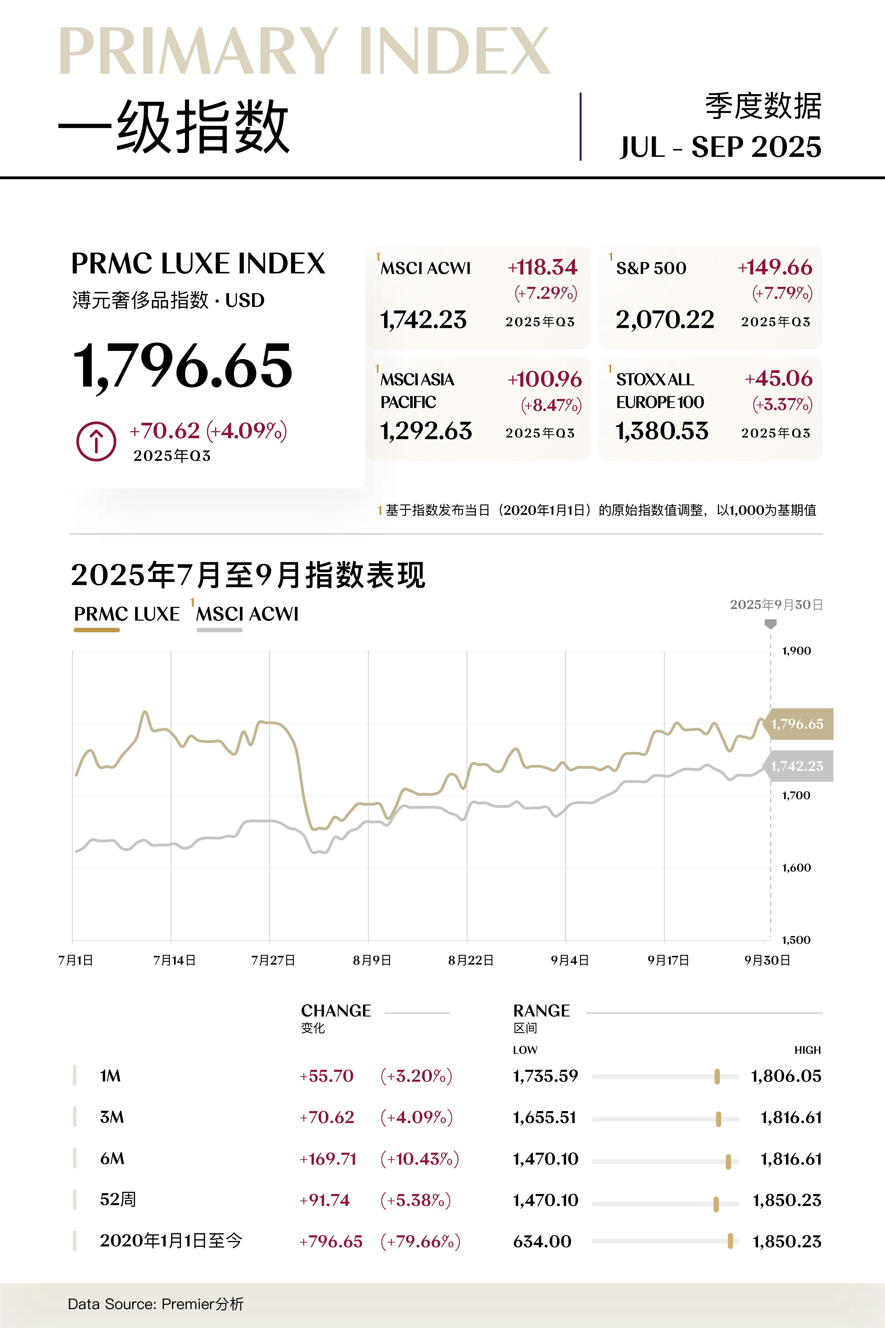溥元奢侈品指数(PRMC Luxe Index)三季度收于1,796.65点,季内上涨70.62点(+4.09%),表现逊于MSCI ASIA PACIFIC(+8.47%)、S&P 500(+7.79%)与MSCI ACWI(+7.29%),但好于STOXX ALL EUROPE 100(+3.37%)。