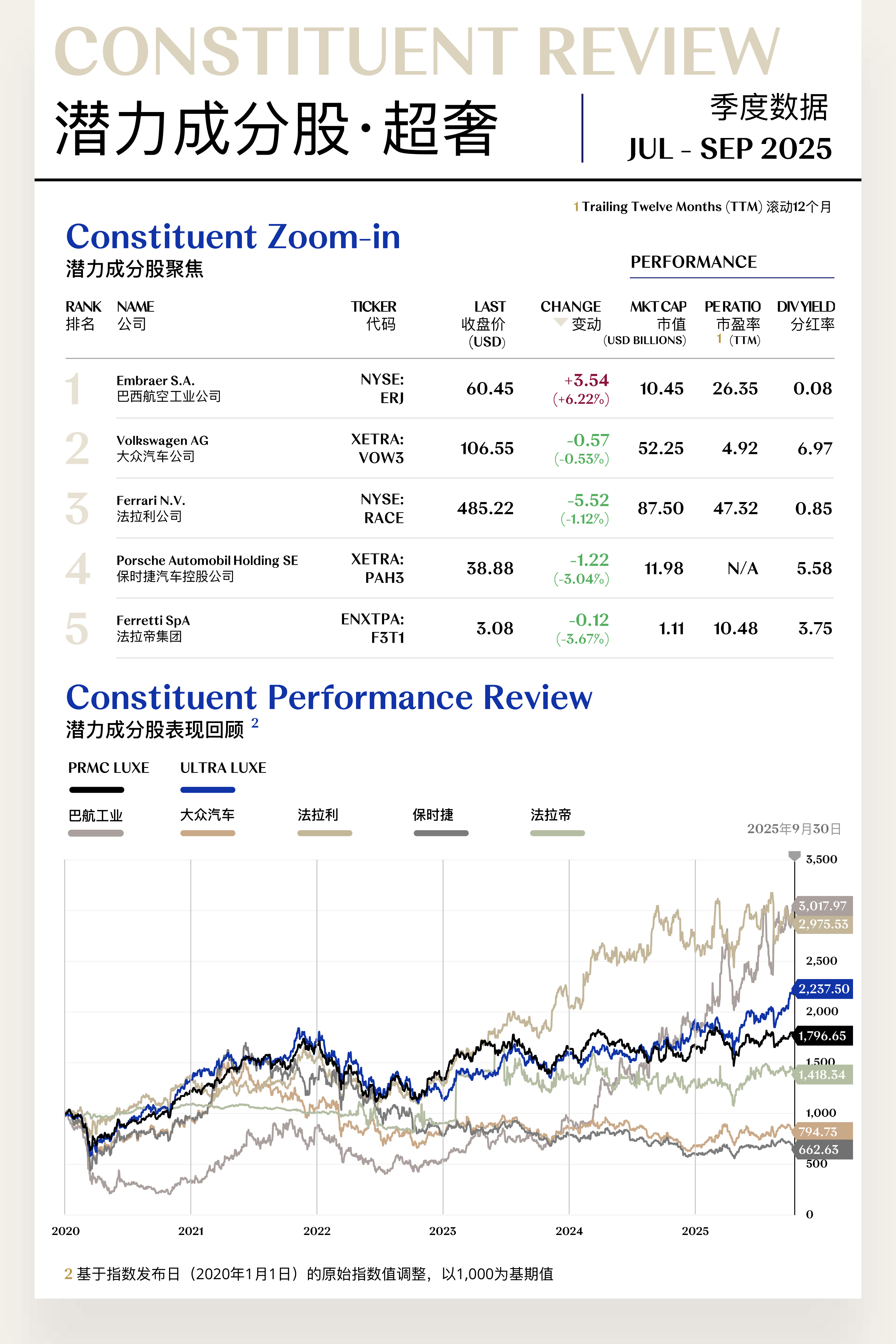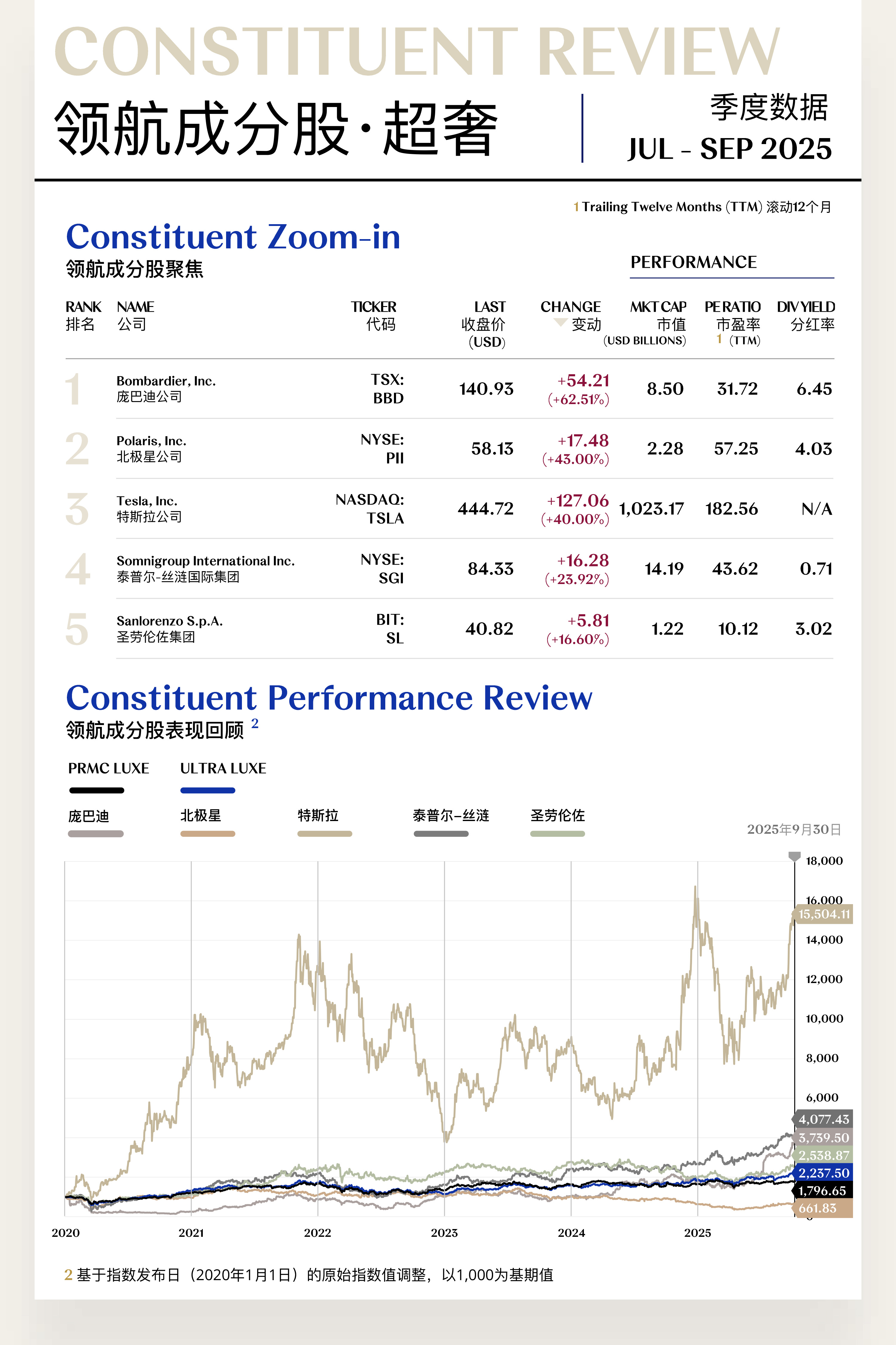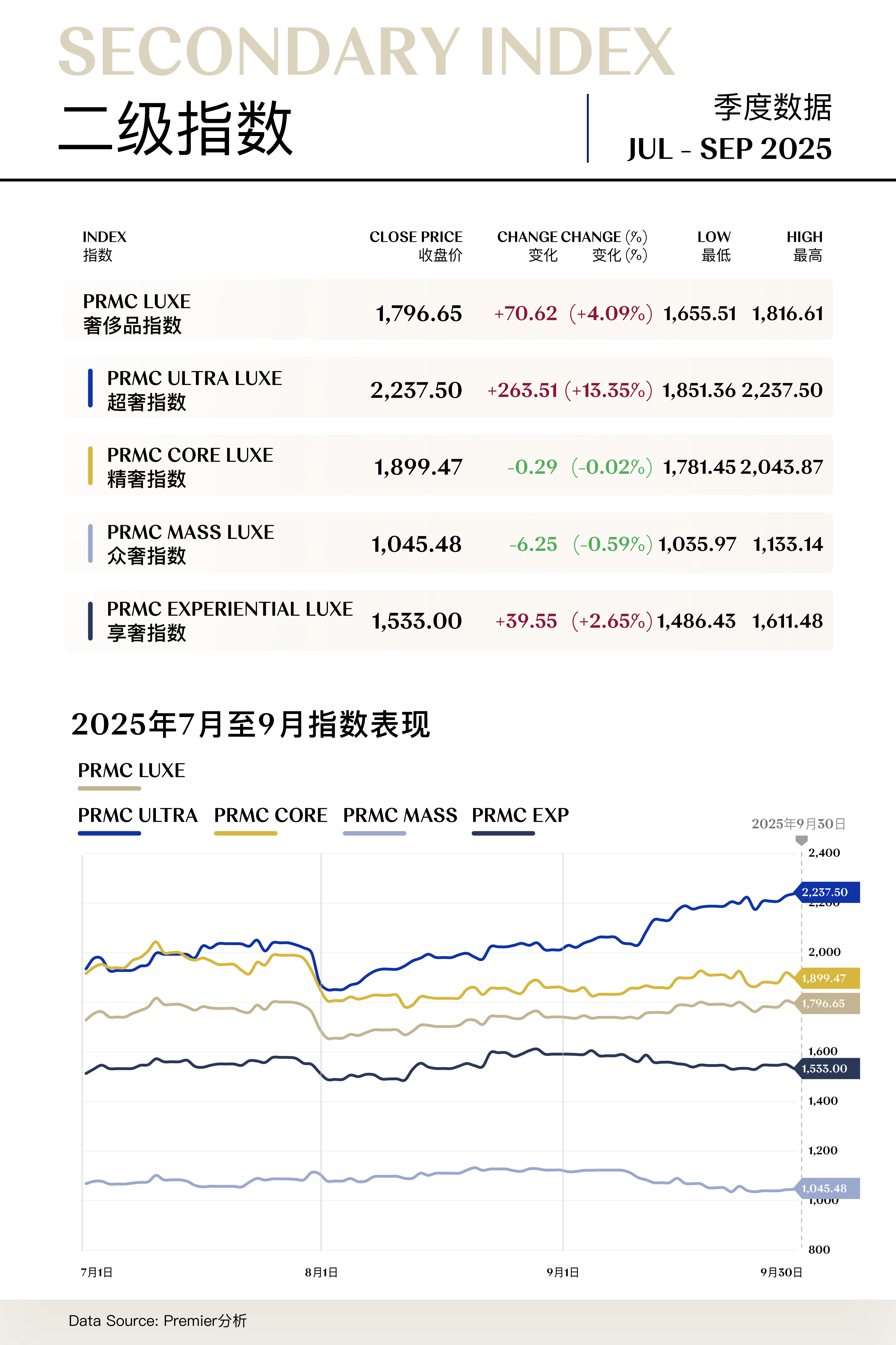超奢指数(PRMC Ultra Luxe Index)三季度收于2,237.50点,季内上涨263.51点(+13.35%);