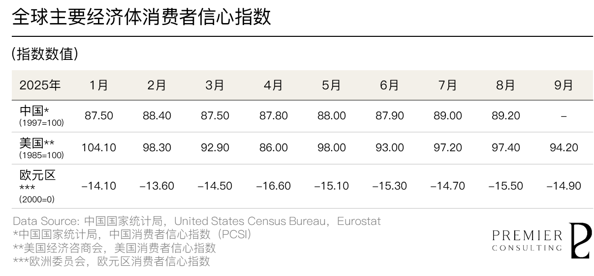 2025年第三季度,中国消费者信心指数延续二季度以来的温和回升态势,7月录得89.00,8月升至89.20,实现连续两月环比上行,并创下年内以来最好表现。