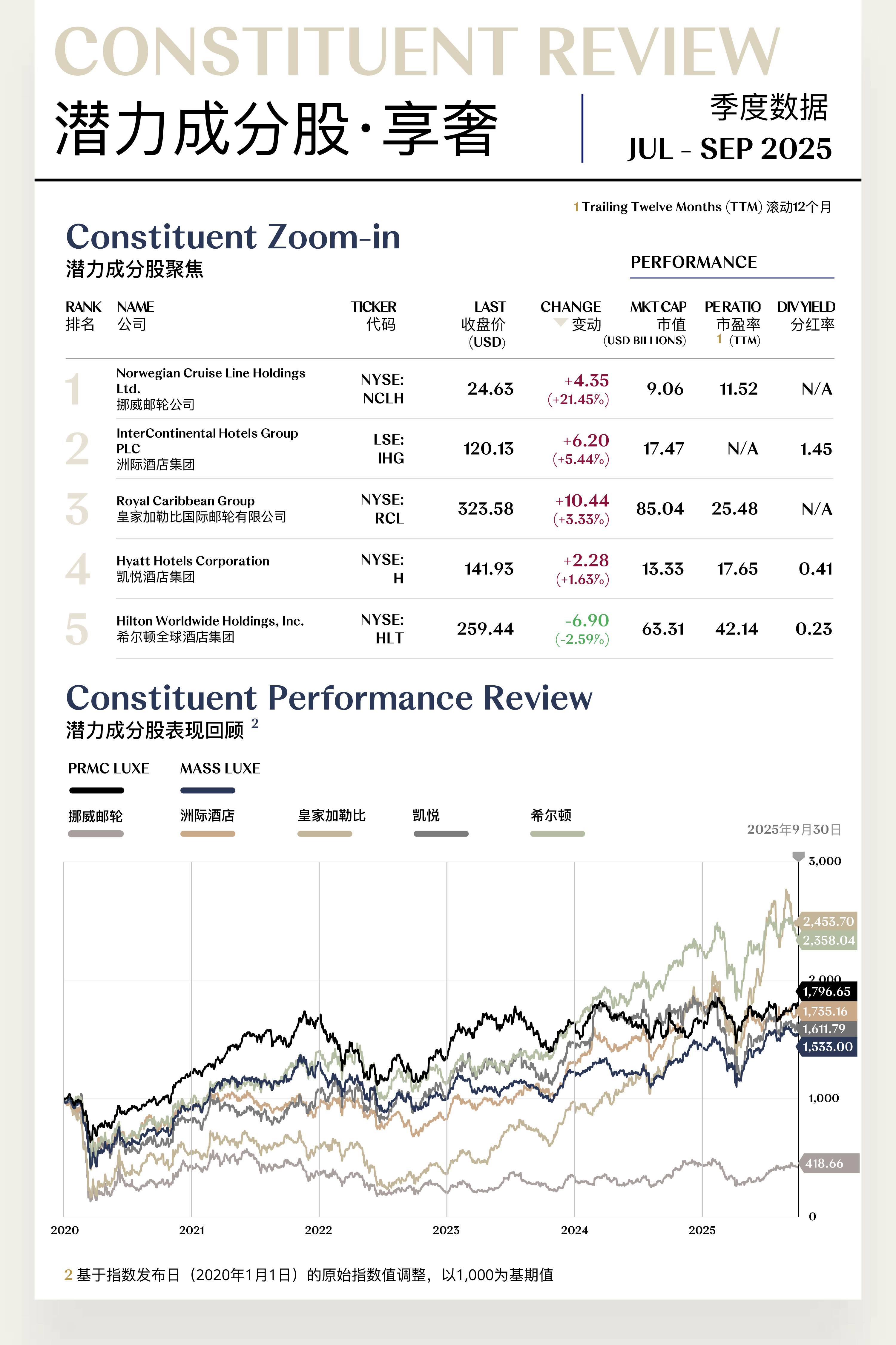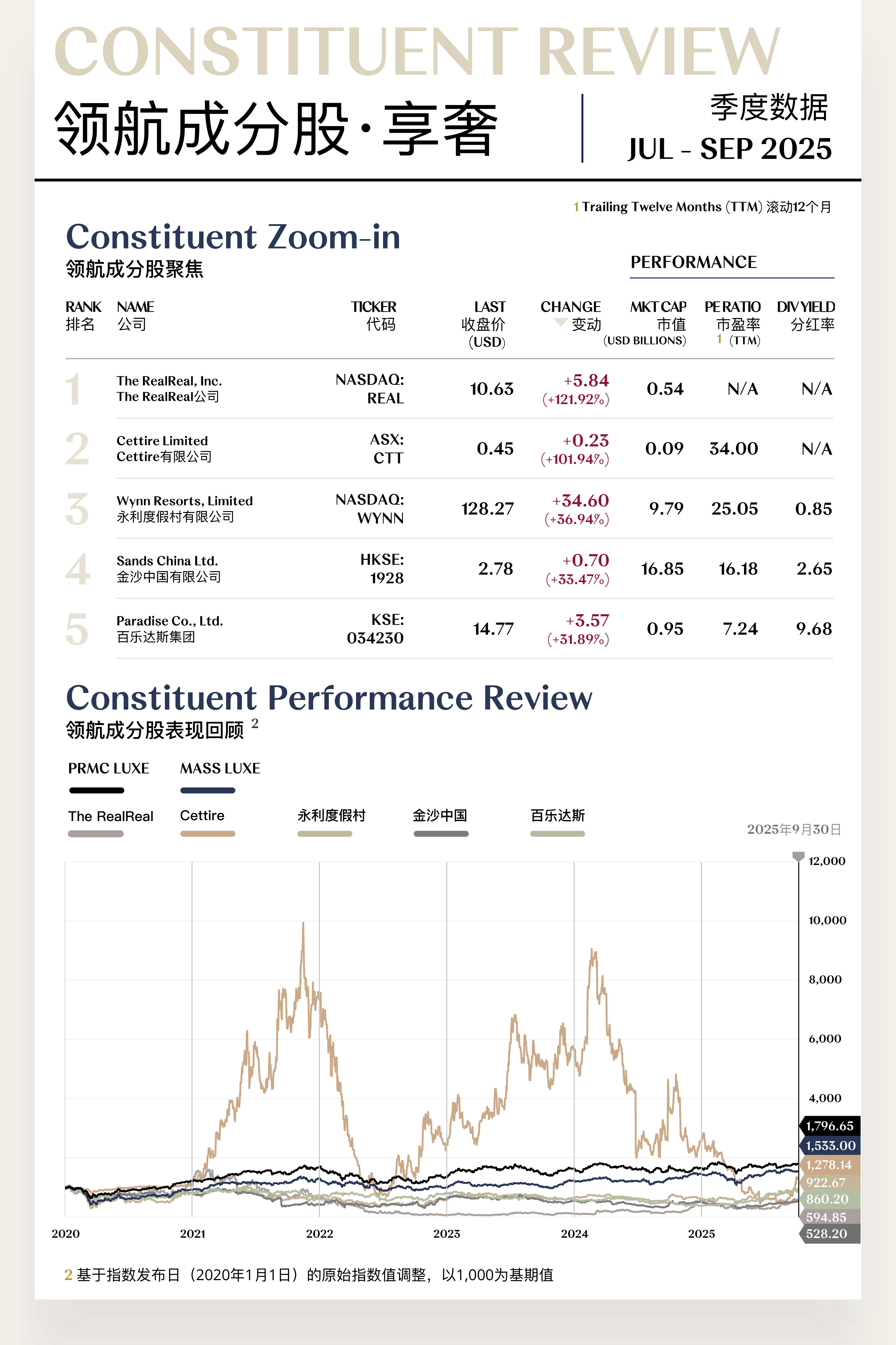 享奢指数(PRMC Experiential Luxe Index)三季度收于1,533.00点,季内上涨39.55点(+2.65%)。