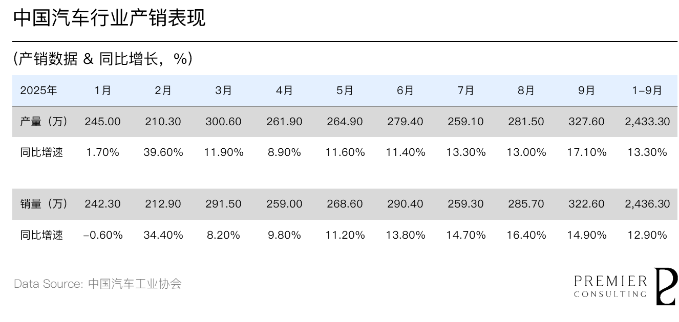 2025年1-9月,我国汽车产销分别完成2,433.30万辆和2,436.30万辆,同比分别增长13.30%和12.90%,增速较1-6月分别扩大0.8和1.5个百分点。