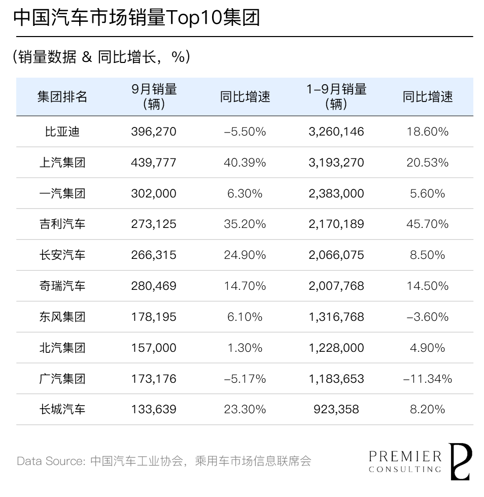 放眼前三季度中国汽车市场,头部车企整体表现良好。其中,比亚迪凭借近330万的年内累计销量和18.60%的同比增速,继续稳居市场领先地位。上汽集团近月复苏态势凸显,9月单月销量达439,777辆,同比大涨40.39%,并带动年内累计销量至近320万辆,以超20%的同比增速向榜首之位发起挑战。