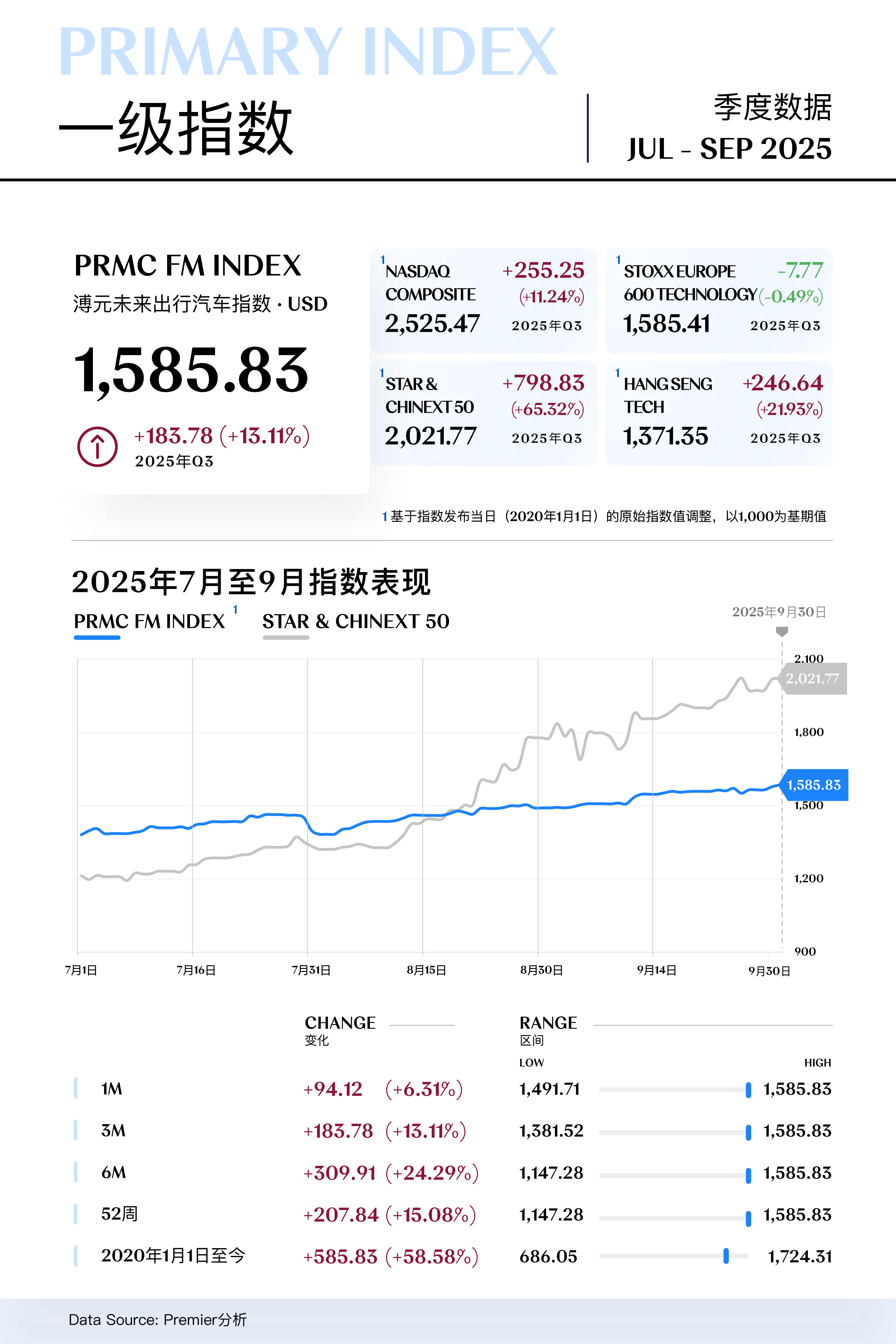 溥元未来出行汽车指数(PRMC Forward Mobility Index)三季度收于1,585.83点,季内回升183.78点(+13.11%),表现逊于STAR & CHINEXT 50(+65.32%)与HANG SENG TECH(+21.93%),但好于NASQAD COMPOSITE(+11.24%)与STOXX EUROPE 600 TECH(-0.49%)。