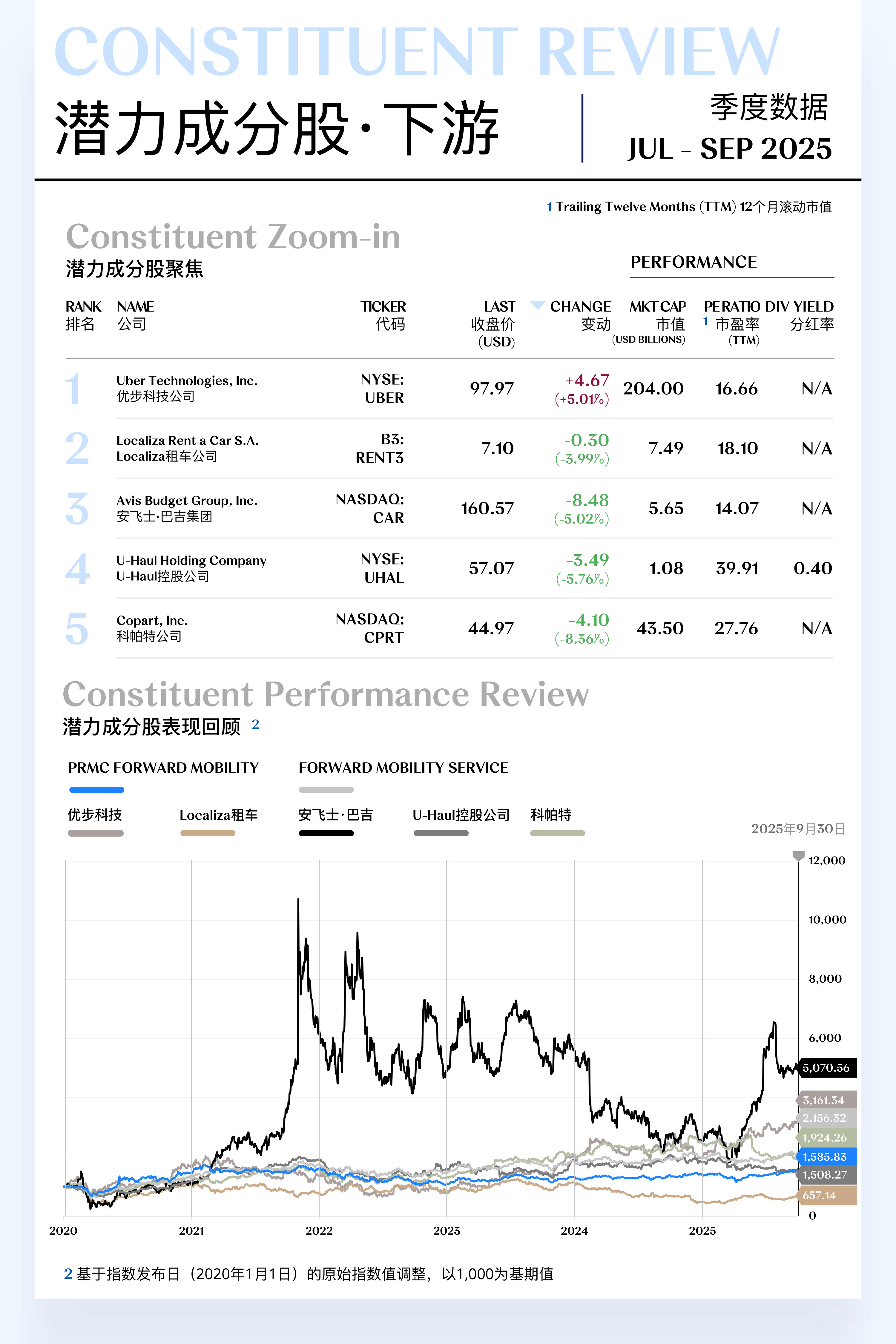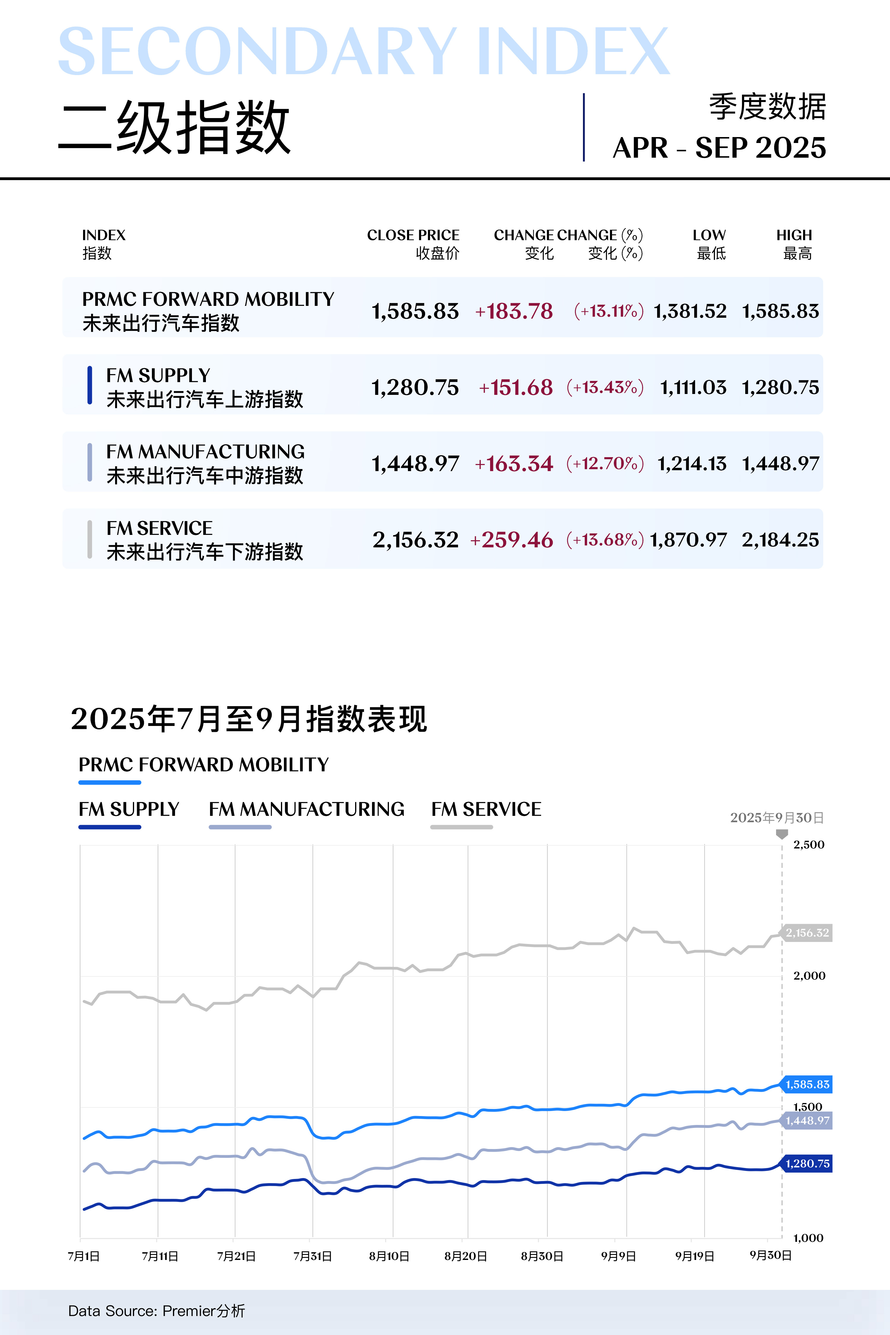 未来出行汽车下游指数(PRMC Forward Mobility Service Index)三季度收于2,156.32点,季内上升259.46点(+13.68%)。
