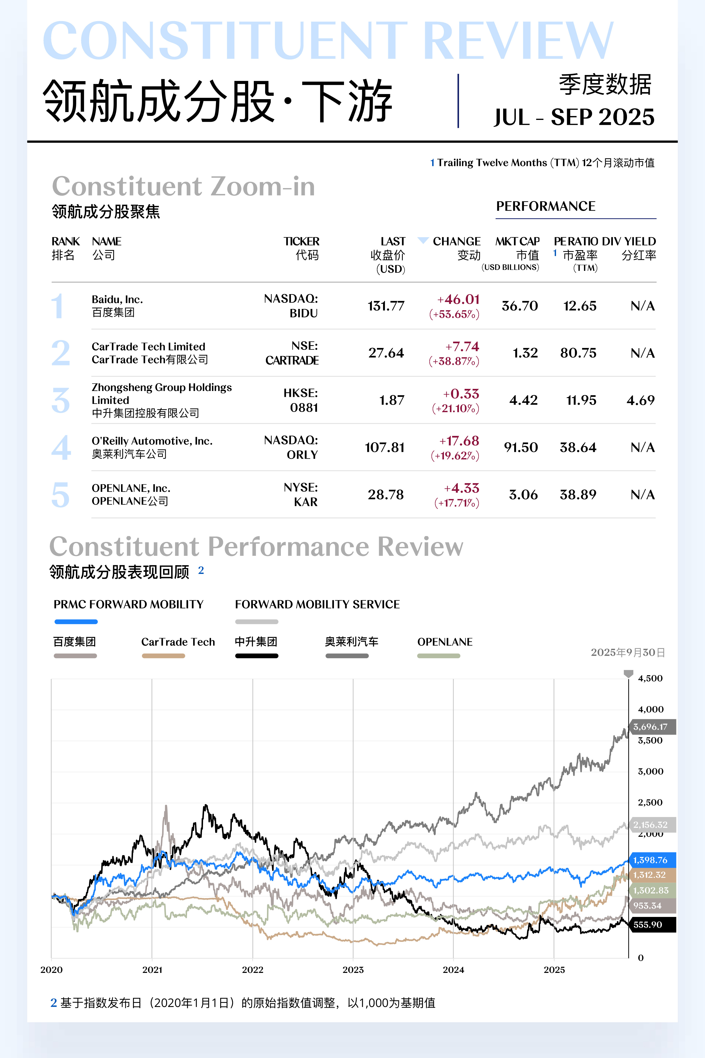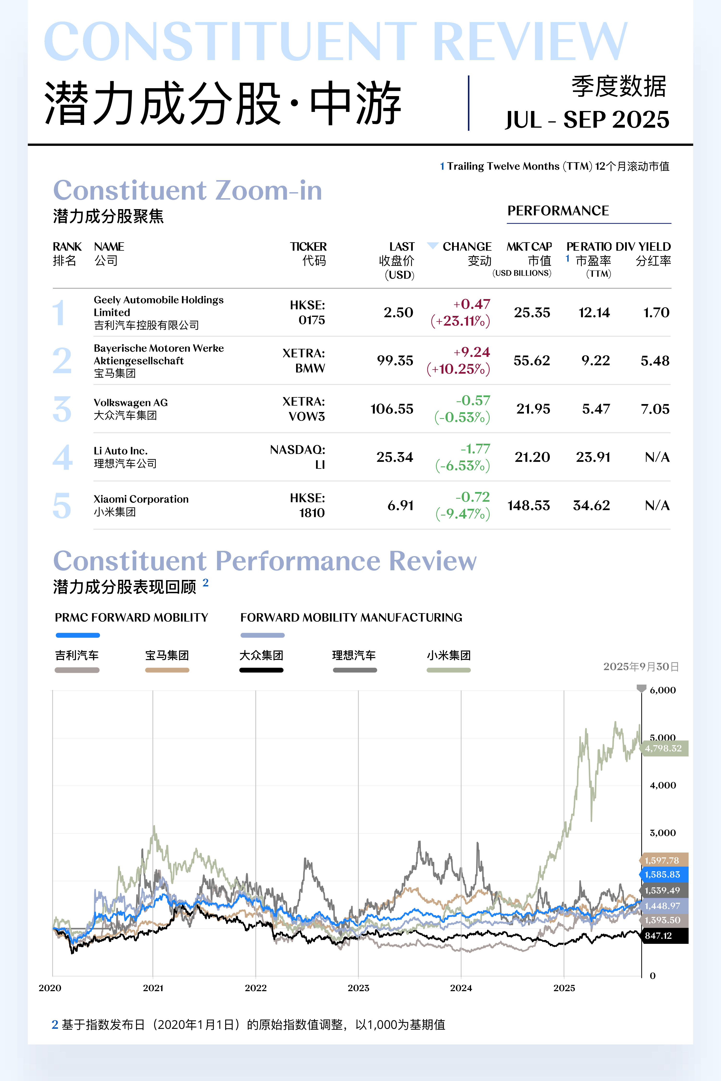 未来出行汽车中游指数(PRMC Forward Mobility Manufacturing Index)三季度收于1,448.97点,季内上升163.34点(+12.70%);