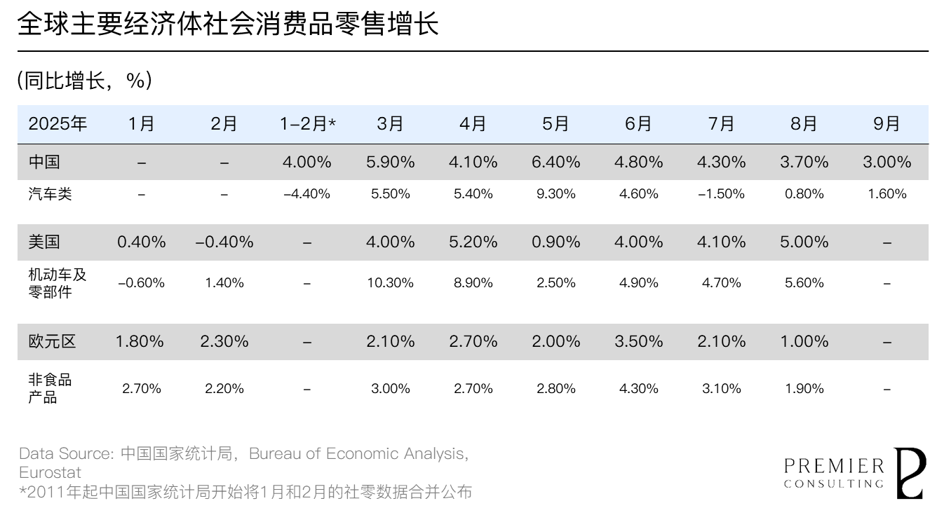 2025年前三季度,我国社会消费品零售总额达365,877亿元,同比增长4.50%。其中,汽车类商品零售总额达35,923亿元,同比增长0.60%,增速逊于整体水平。但随着9月汽车消费录得1.60%的增长,汽车类消费正逐步走向企稳修复之路。