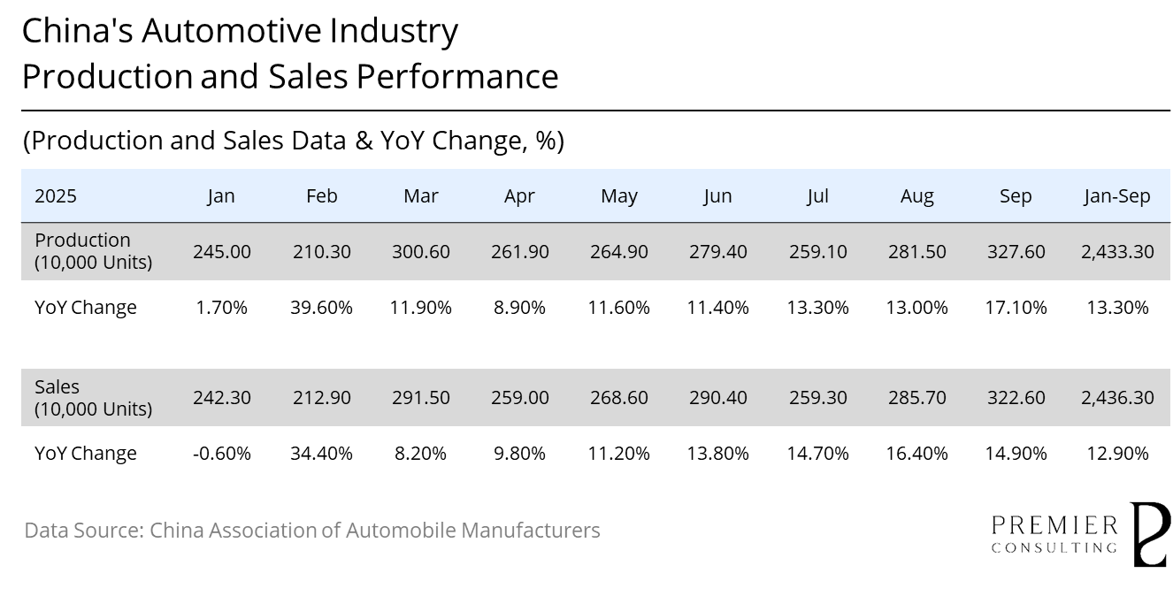 The automotive industry in Q3 2025 continued steady progress, with production and sales maintaining double-digit growth.