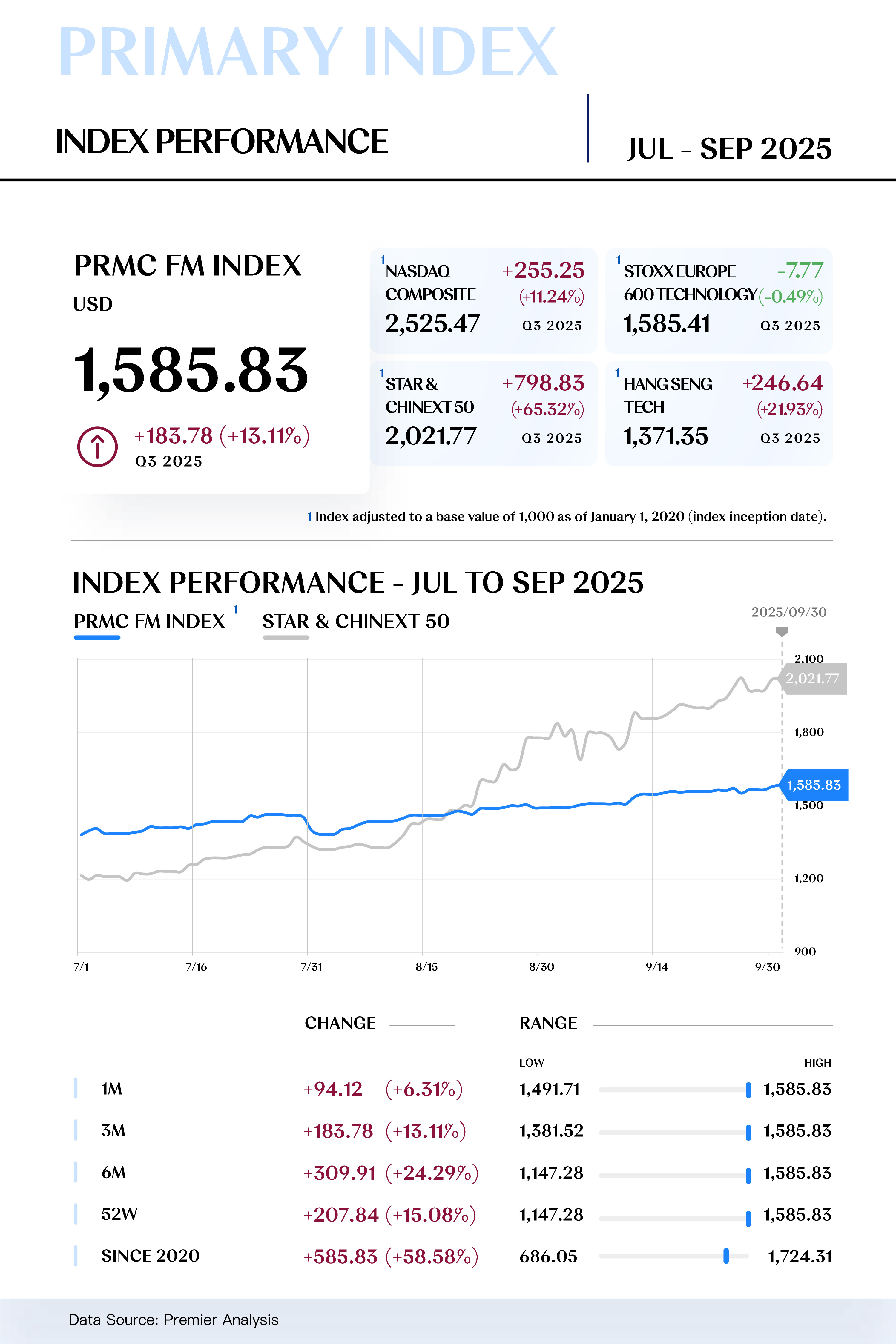 The PRMC Forward Mobility Index closed at 1,585.83 points in Q3 2025, rising by 183.78 points (+13.11%) during the quarter. The performance was weaker compared to the STAR & CHINEXT 50 (+65.32%) and HANG SENG TECH (+21.93%), but better than the NASDAQ COMPOSITE (+11.24%) and STOXX EUROPE 600 TECH (-0.49%).