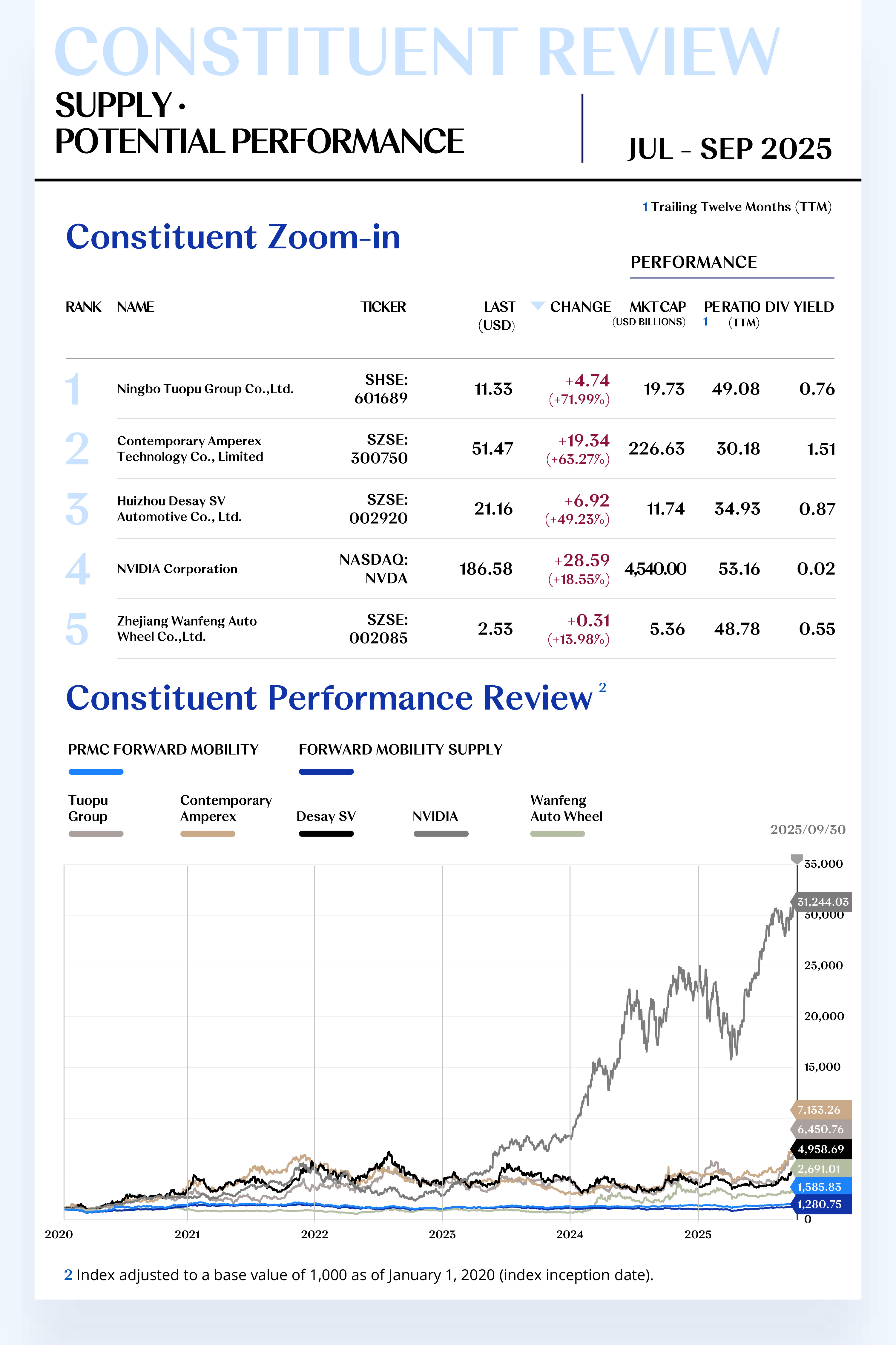In the third quarter of 2025, the PRMC Forward Mobility Index closed at 1,585.83 points, marking an increase of 183.78 points, or 13.11%. Geopolitical and international trade conditions continued to improve in the third quarter of 2025, boosting global automotive industry confidence. The easing of tensions in the Middle East and the ceasefire agreement between Israel and Iran reduced global risk aversion, preventing a systemic rise in oil prices and stabilizing energy and logistics costs. This provided strong cost support for the automotive supply chain. Additionally, U.S.-China trade tensions showed signs of a positive shift as high-level consultations between the two nations were resumed, and a new trade framework agreement was reached, alleviating concerns about supply chain disruptions and creating a more stable external environment for global automotive companies’ strategic planning and cost control.