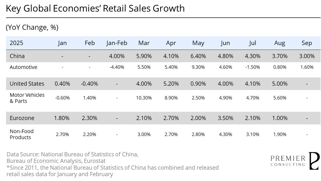 In the first three quarters of 2025, China’s total retail sales of consumer goods reached RMB 36.5877 trillion, growing by 4.50% year-on-year. Among this, retail sales of automotive products totaled RMB 3.5923 trillion, a growth of 0.60%, which lagged behind the overall retail growth rate. However, with automotive consumption showing a 1.60% growth in September, the sector is gradually stabilizing and recovering.